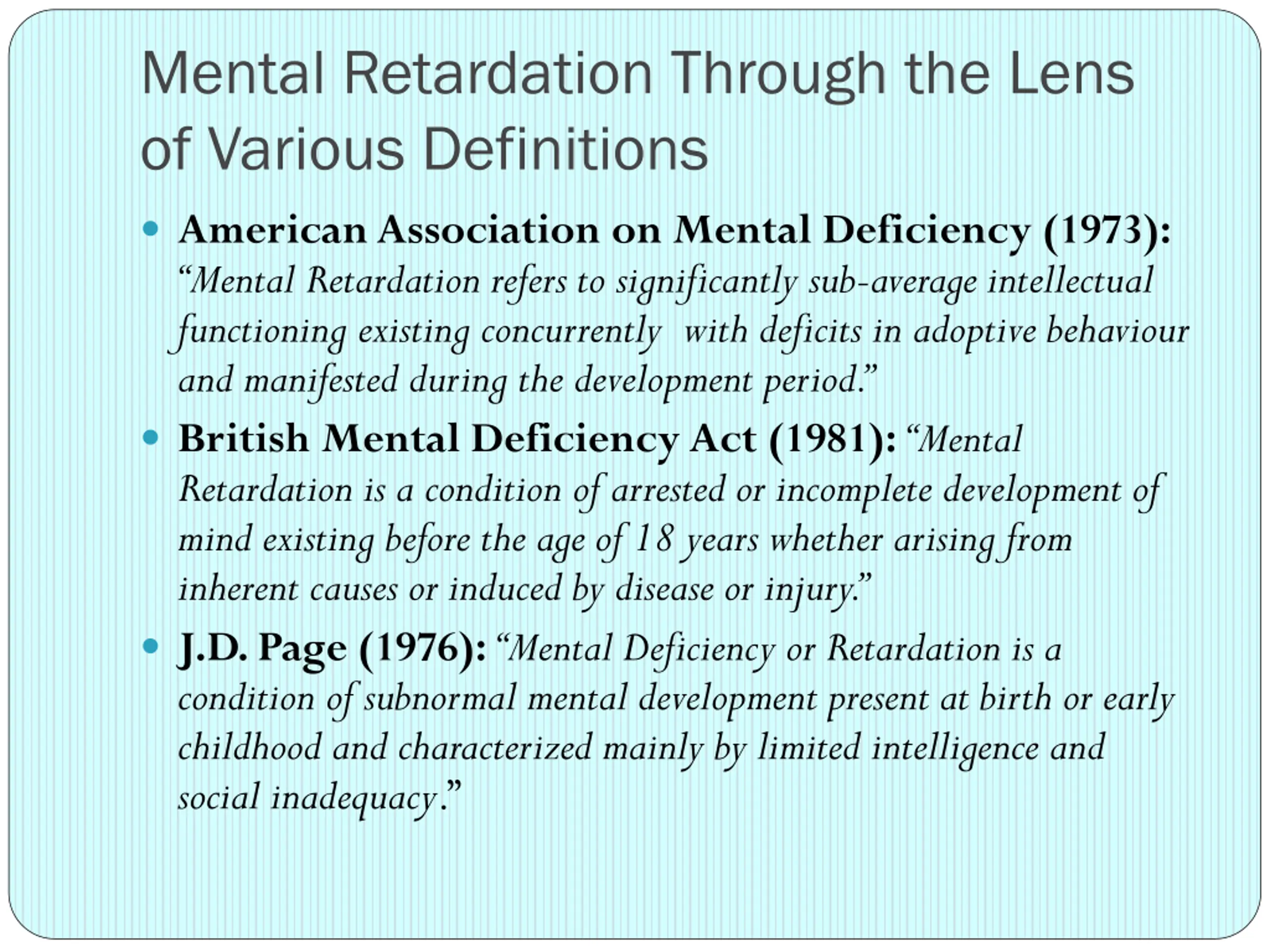 Mental Retardation Through the Lens of Various Definitions American Association on Mental Deficiency (1973): Mental Retardation refers to significantly sub-average intellectual functioning existing concurrently with deficits in adoptive behaviour and manifested during the development period. British Mental Deficiency Act (1981): Mental Retardation is a condition of arrested or incomplete development of mind existing before the age of 18 years whether arising from inherent causes or induced by disease or injury. J.D. Page (1976): Mental Deficiency or Retardation is a condition of subnormal mental development present at birth or early childhood and characterized mainly by limited intelligence and social inadequacy.