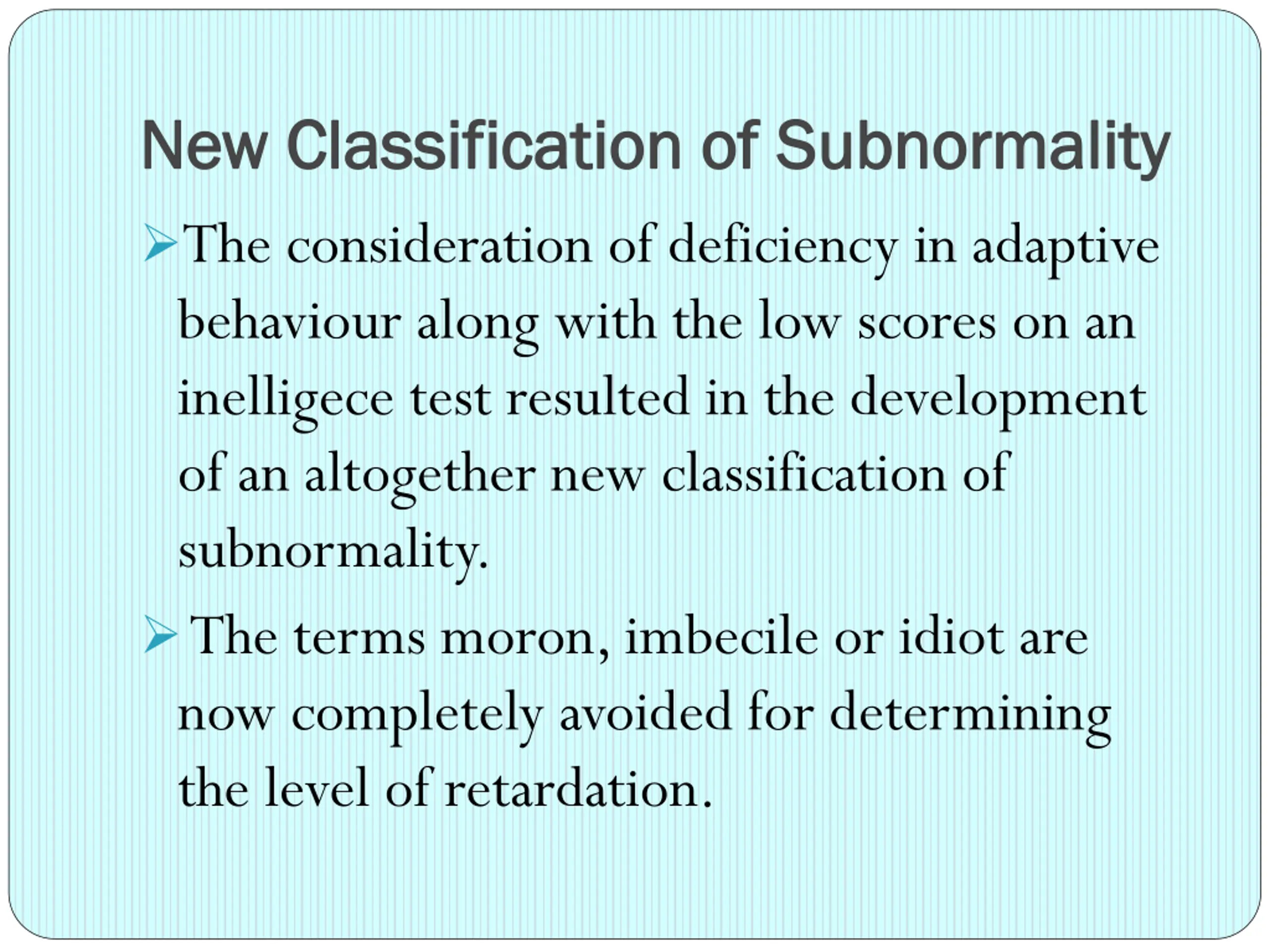 New Classification of New Classification of Subnormality The consideration of deficiency in adaptive behaviour along with the low scores on an inelligece test resulted in the development of an altogether new classification of subnormality. The terms moron, imbecile or idiot are now completely avoided for determining the level of retardation. Subnormality