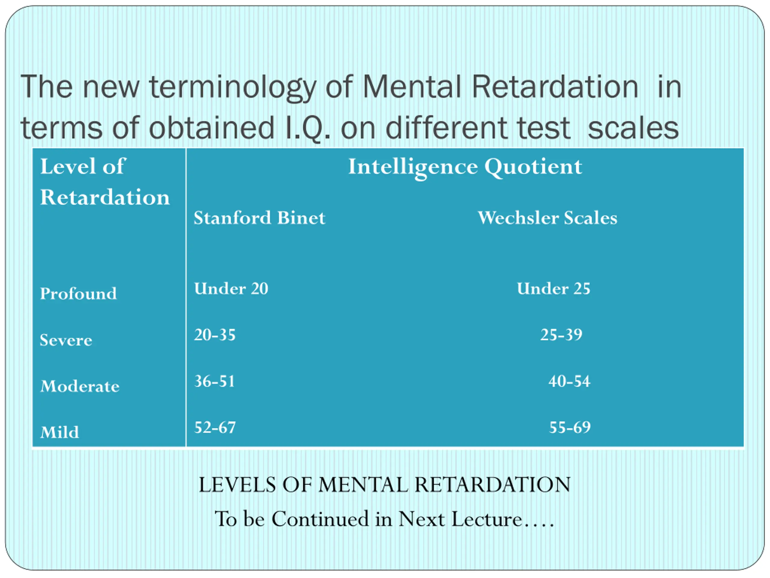 The new terminology of Mental Retardation in terms of obtained I.Q. on different test scales Level of Retardation Stanford Binet Intelligence Quotient Wechsler Scales Under 20 Under 25 Profound 20-35 25-39 Severe 36-51 40-54 Moderate 52-67 55-69 Mild LEVELS OF MENTAL RETARDATION To be Continued in Next Lecture .