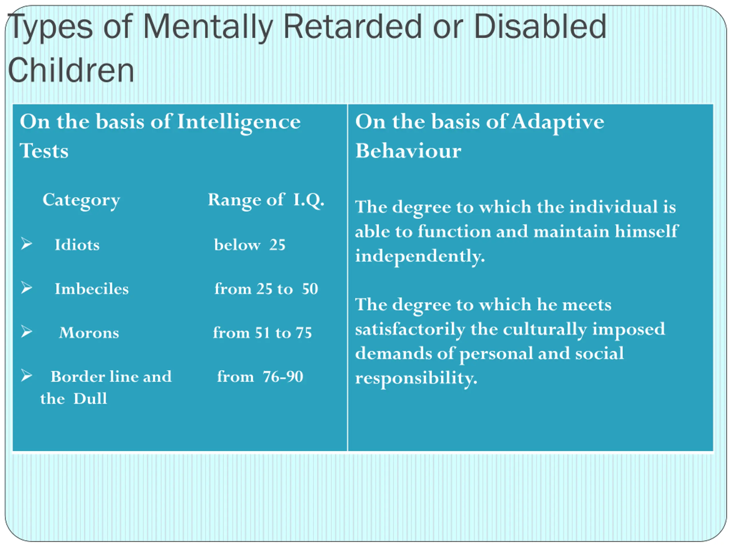 Types of Mentally Retarded or Disabled Children On the basis of Intelligence Tests On the basis of Adaptive Behaviour Category Range of I.Q. The degree to which the individual is able to function and maintain himself independently. Idiots below 25 Imbeciles from 25 to 50 The degree to which he meets satisfactorily the culturally imposed demands of personal and social responsibility. Morons from 51 to 75 Border line and from 76-90 the Dull