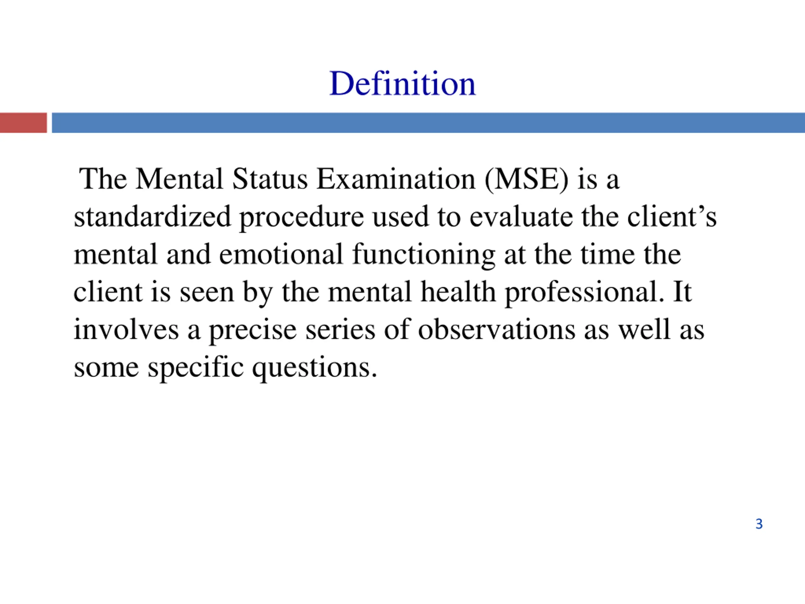 Definition The Mental Status Examination (MSE) is a standardized procedure used to evaluate the client s mental and emotional functioning at the time the client is seen by the mental health professional. It involves a precise series of observations as well as some specific questions. 3