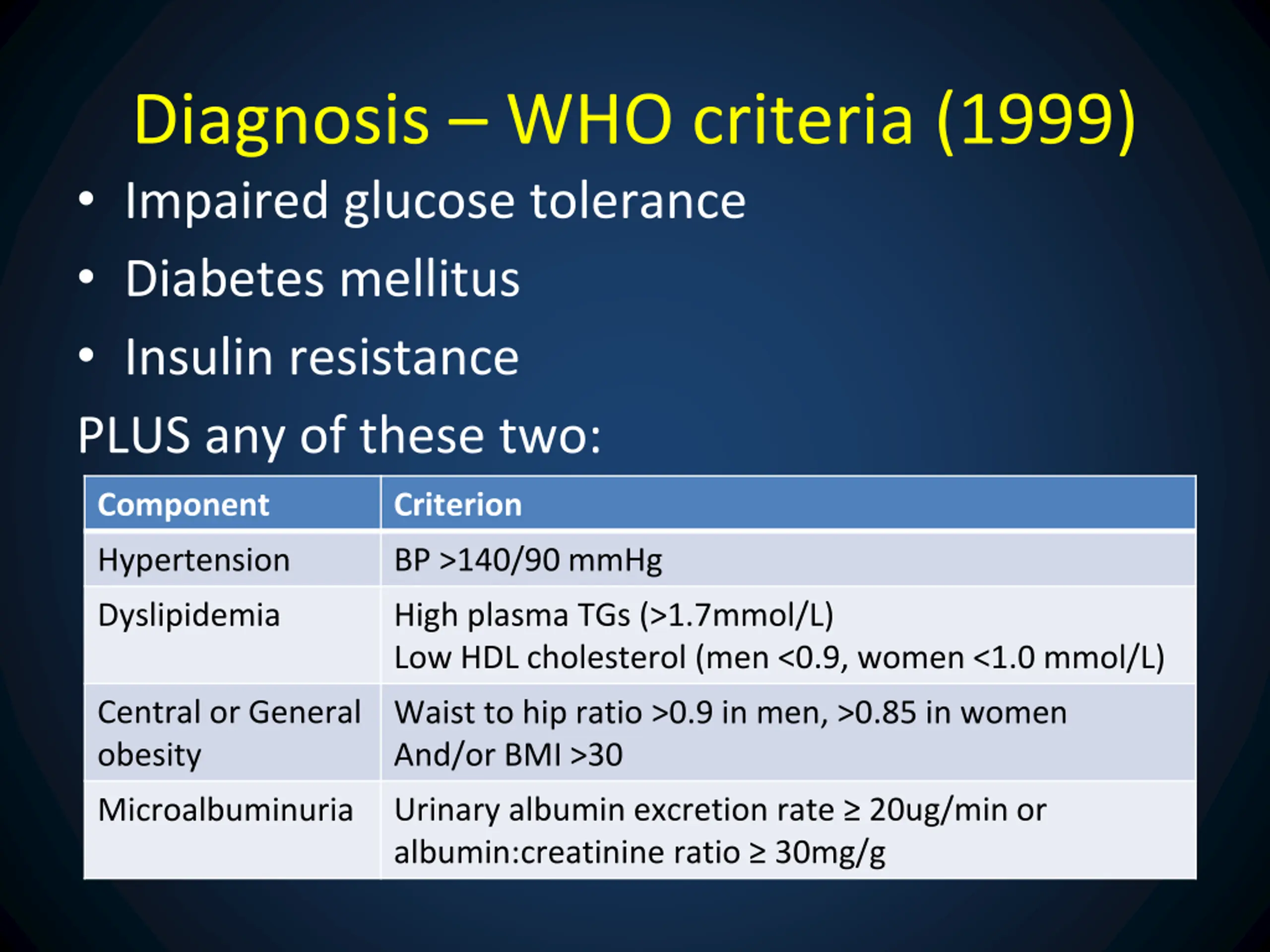 Diagnosis WHO criteria (1999) Impaired glucose tolerance Diabetes mellitus Insulin resistance PLUS any of these two: Component Criterion Hypertension BP >140/90 mmHg Dyslipidemia High plasma TGs (>1.7mmol/L) Low HDL cholesterol (men <0.9, women <1.0 mmol/L) Central or General obesity Waist to hip ratio >0.9 in men, >0.85 in women And/or BMI >30 Urinary albumin excretion rate 20ug/min or albumin:creatinine ratio 30mg/g Microalbuminuria