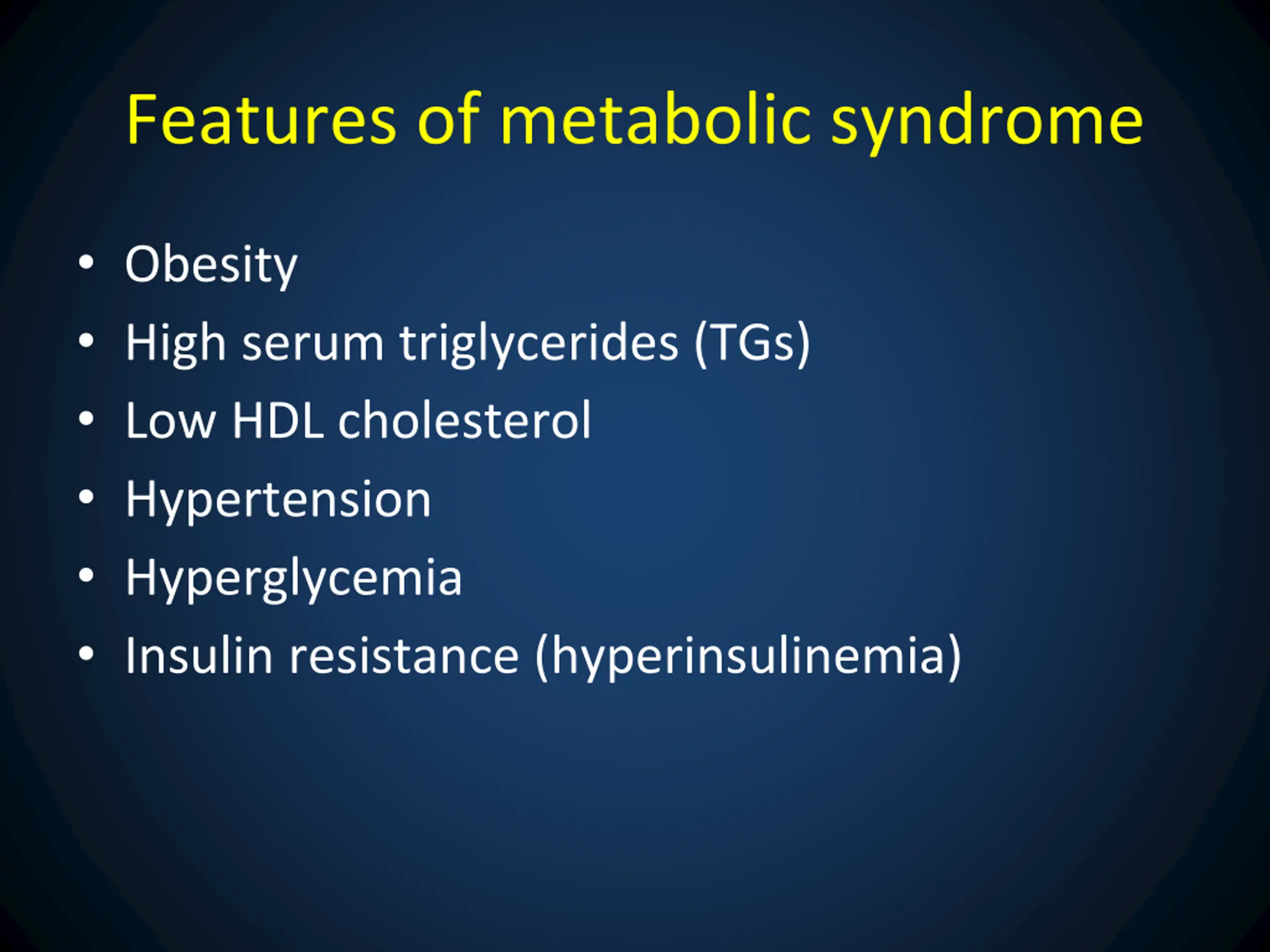 Features of metabolic syndrome Obesity High serum triglycerides (TGs) Low HDL cholesterol Hypertension Hyperglycemia Insulin resistance (hyperinsulinemia)