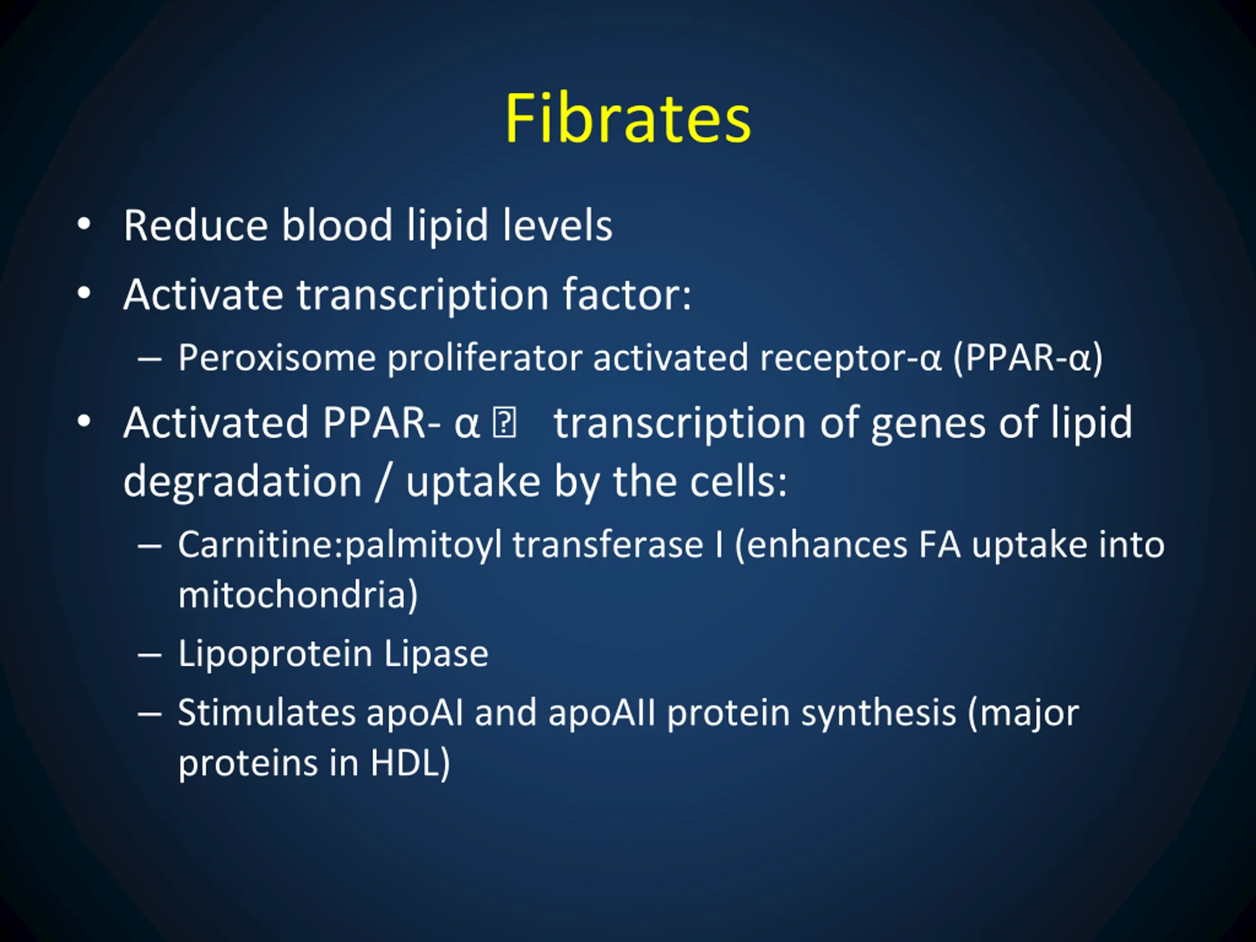 Fibrates Reduce blood lipid levels Activate transcription factor: Peroxisome proliferator activated receptor- (PPAR- ) Activated PPAR- ? transcription of genes of lipid degradation / uptake by the cells: Carnitine:palmitoyl transferase I (enhances FA uptake into mitochondria) Lipoprotein Lipase Stimulates apoAI and apoAII protein synthesis (major proteins in HDL)