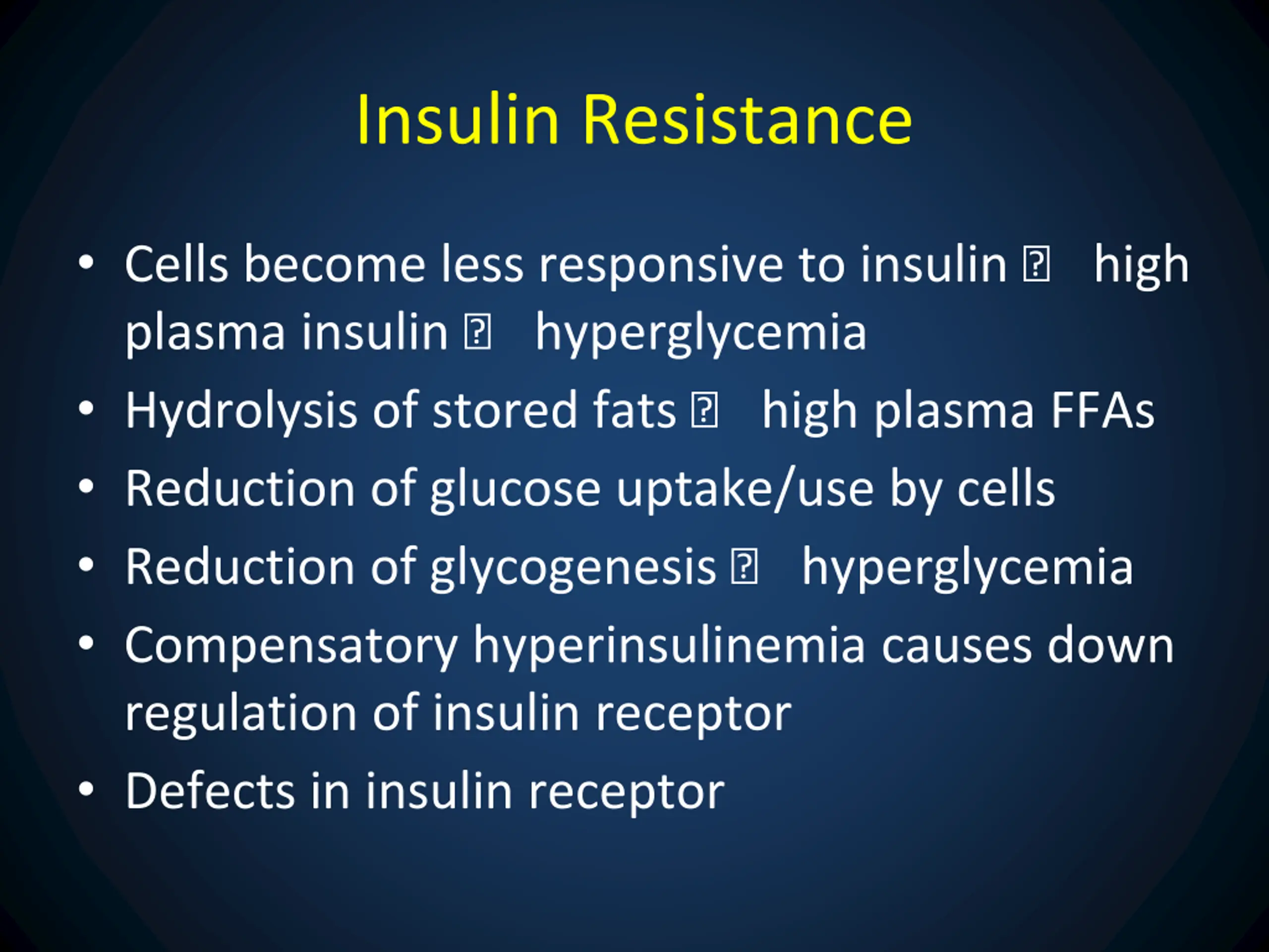 Insulin Resistance Cells become less responsive to insulin ? high plasma insulin ? hyperglycemia Hydrolysis of stored fats ? high plasma FFAs Reduction of glucose uptake/use by cells Reduction of glycogenesis ? hyperglycemia Compensatory hyperinsulinemia causes down regulation of insulin receptor Defects in insulin receptor
