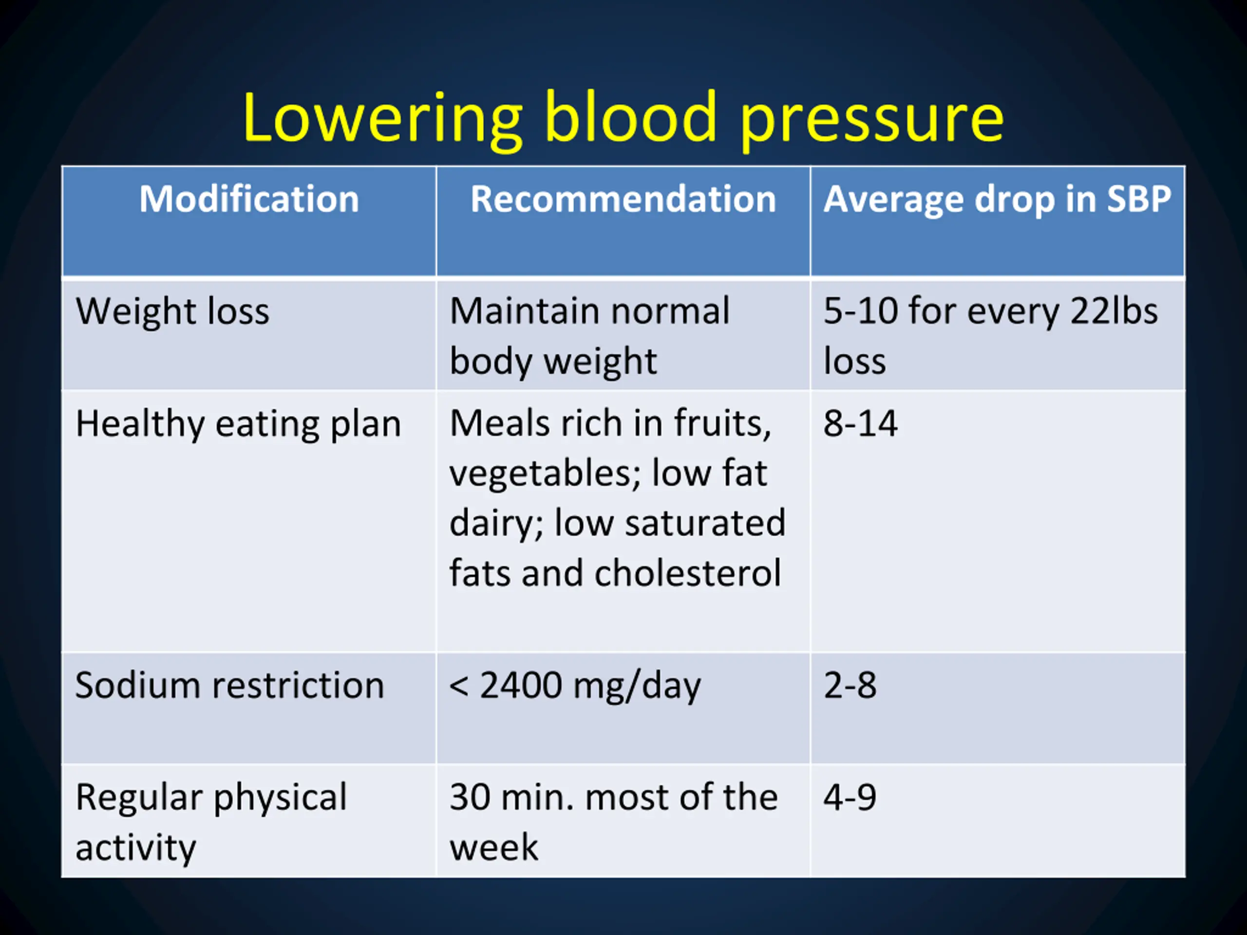 Lowering blood pressure Modification Recommendation Average drop in SBP Maintain normal body weight Meals rich in fruits, vegetables; low fat dairy; low saturated fats and cholesterol 5-10 for every 22lbs loss Weight loss Healthy eating plan 8-14 Sodium restriction < 2400 mg/day 2-8 Regular physical activity 30 min. most of the week 4-9