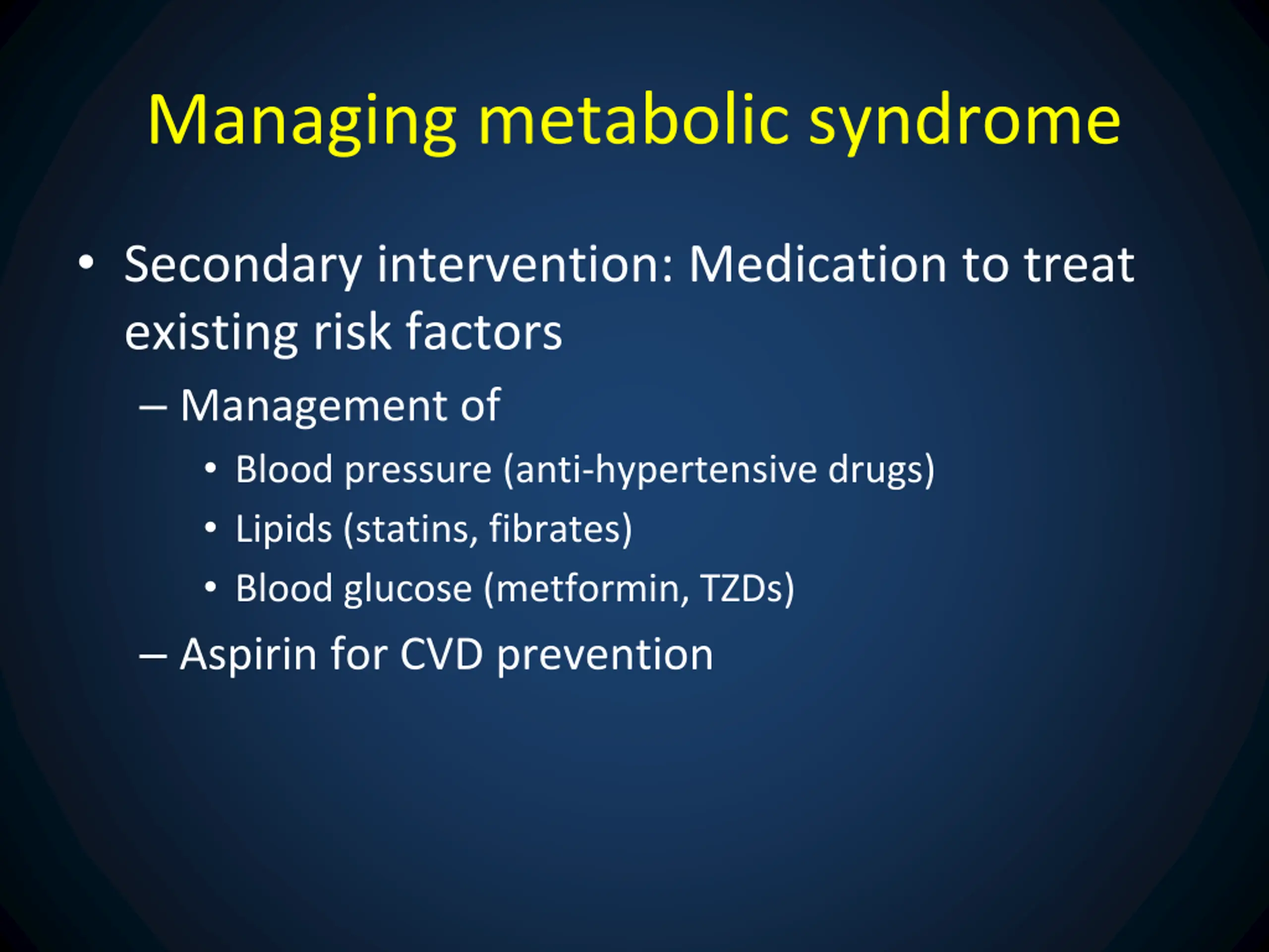 Managing metabolic syndrome Secondary intervention: Medication to treat existing risk factors Management of Blood pressure (anti-hypertensive drugs) Lipids (statins, fibrates) Blood glucose (metformin, TZDs) Aspirin for CVD prevention