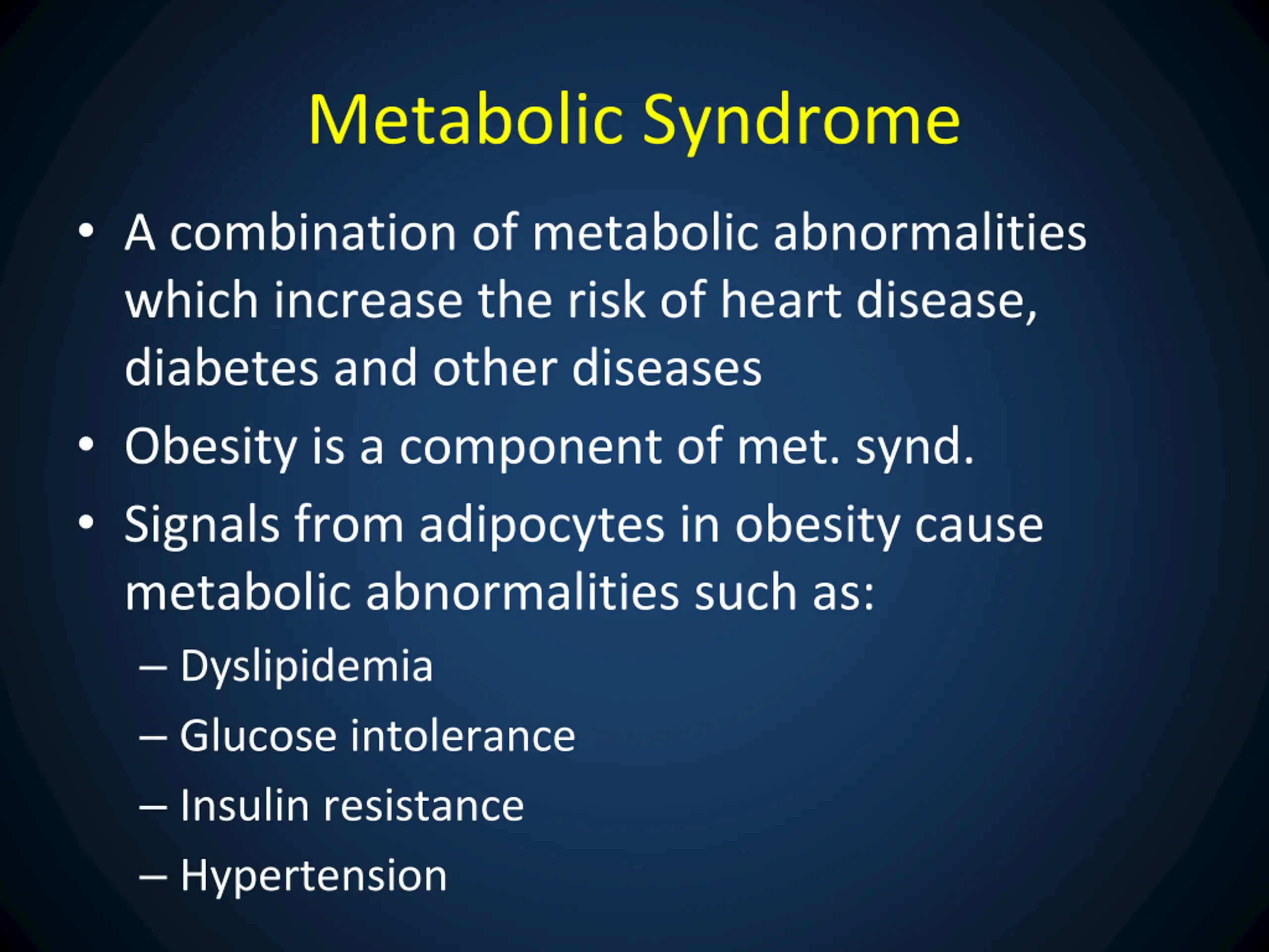 Metabolic Syndrome A combination of metabolic abnormalities which increase the risk of heart disease, diabetes and other diseases Obesity is a component of met. synd. Signals from adipocytes in obesity cause metabolic abnormalities such as: Dyslipidemia Glucose intolerance Insulin resistance Hypertension