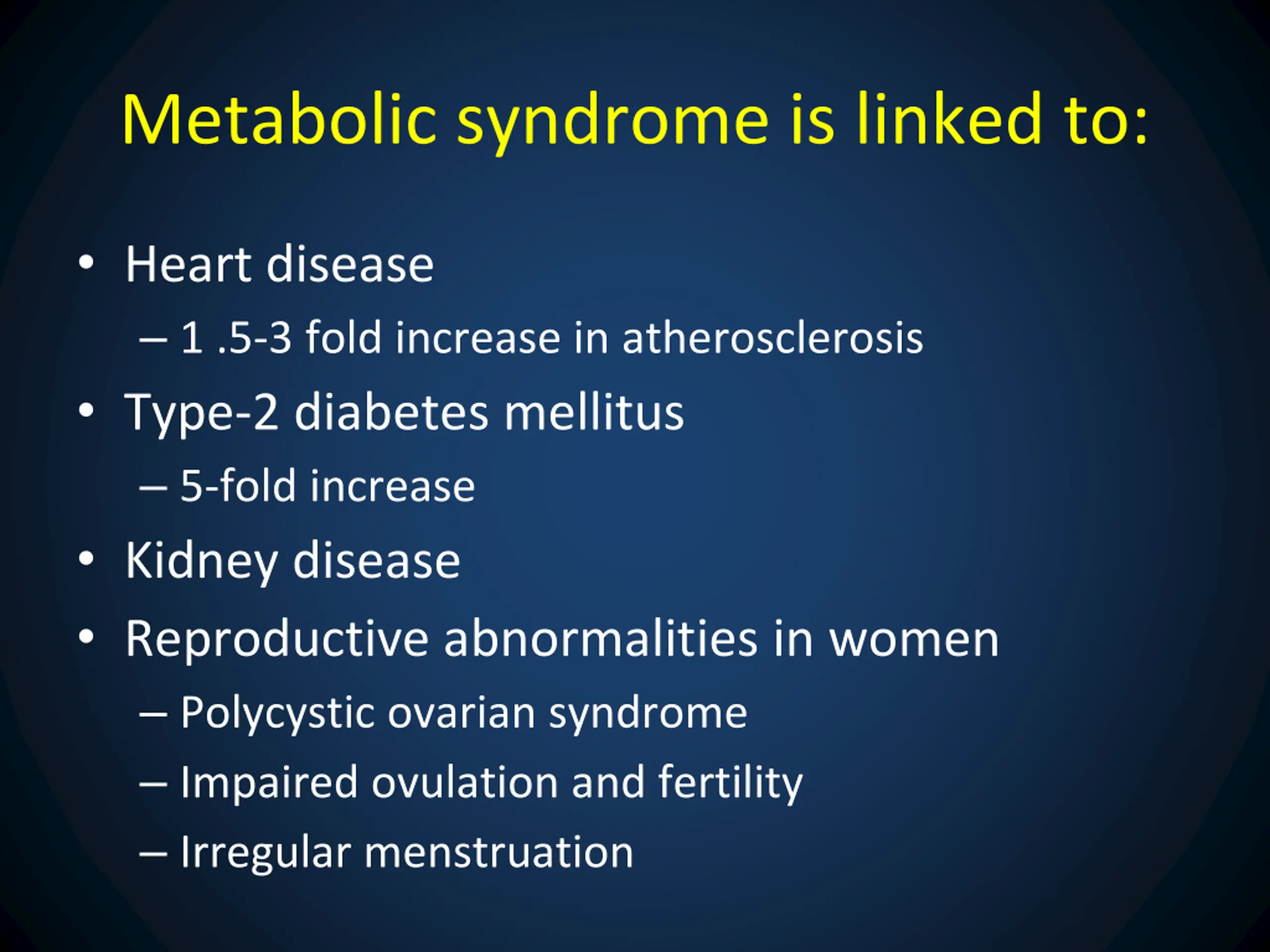Metabolic syndrome is linked to: Heart disease 1 .5-3 fold increase in atherosclerosis Type-2 diabetes mellitus 5-fold increase Kidney disease Reproductive abnormalities in women Polycystic ovarian syndrome Impaired ovulation and fertility Irregular menstruation
