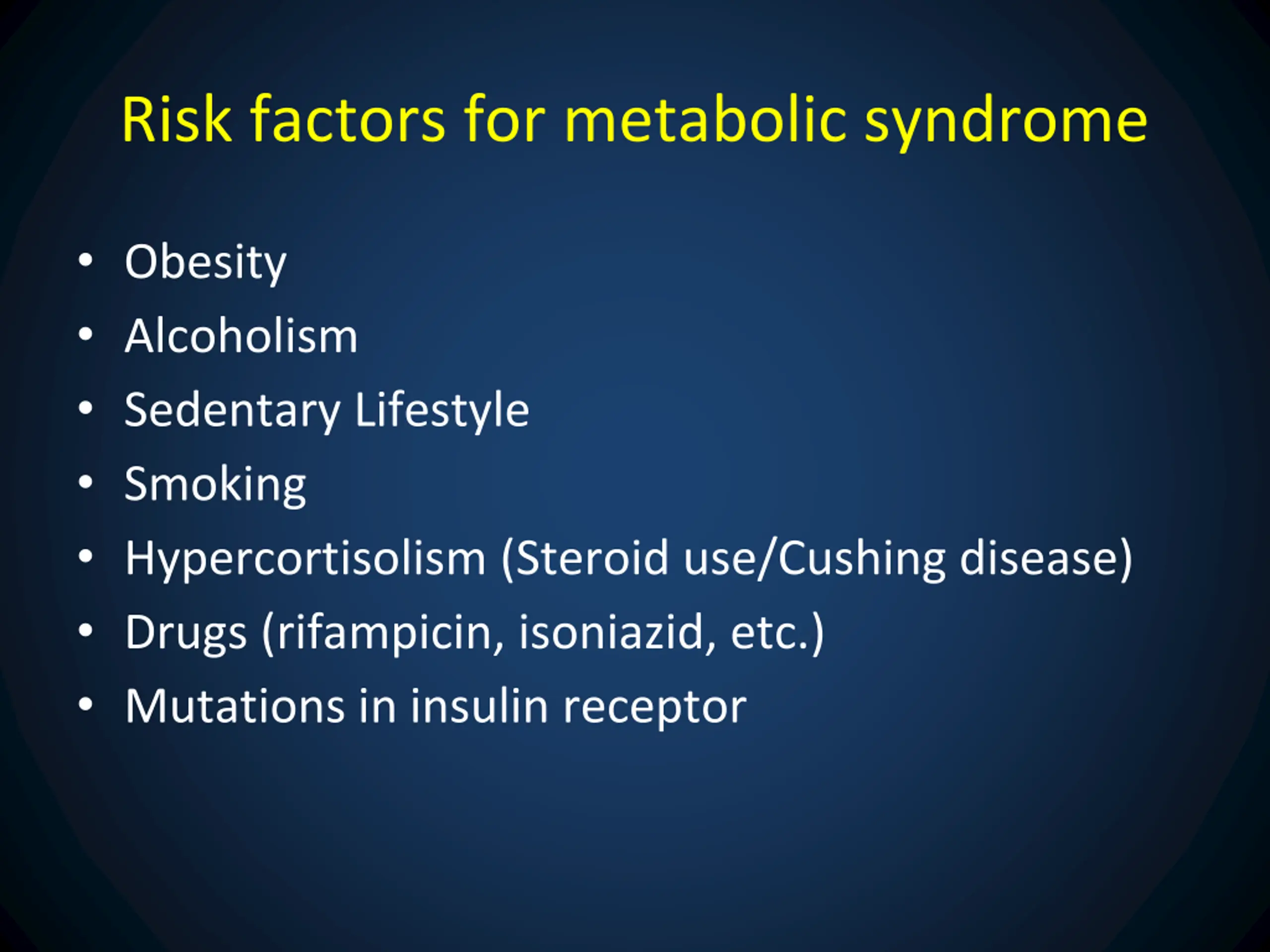 Risk factors for metabolic syndrome Obesity Alcoholism Sedentary Lifestyle Smoking Hypercortisolism (Steroid use/Cushing disease) Drugs (rifampicin, isoniazid, etc.) Mutations in insulin receptor