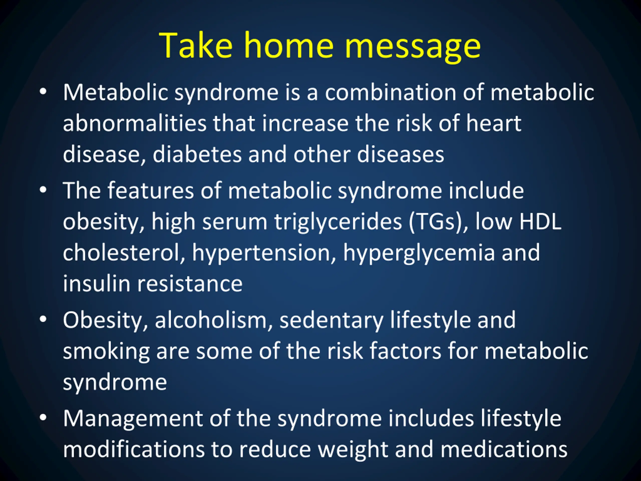 Take home message Metabolic syndrome is a combination of metabolic abnormalities that increase the risk of heart disease, diabetes and other diseases The features of metabolic syndrome include obesity, high serum triglycerides (TGs), low HDL cholesterol, hypertension, hyperglycemia and insulin resistance Obesity, alcoholism, sedentary lifestyle and smoking are some of the risk factors for metabolic syndrome Management of the syndrome includes lifestyle modifications to reduce weight and medications