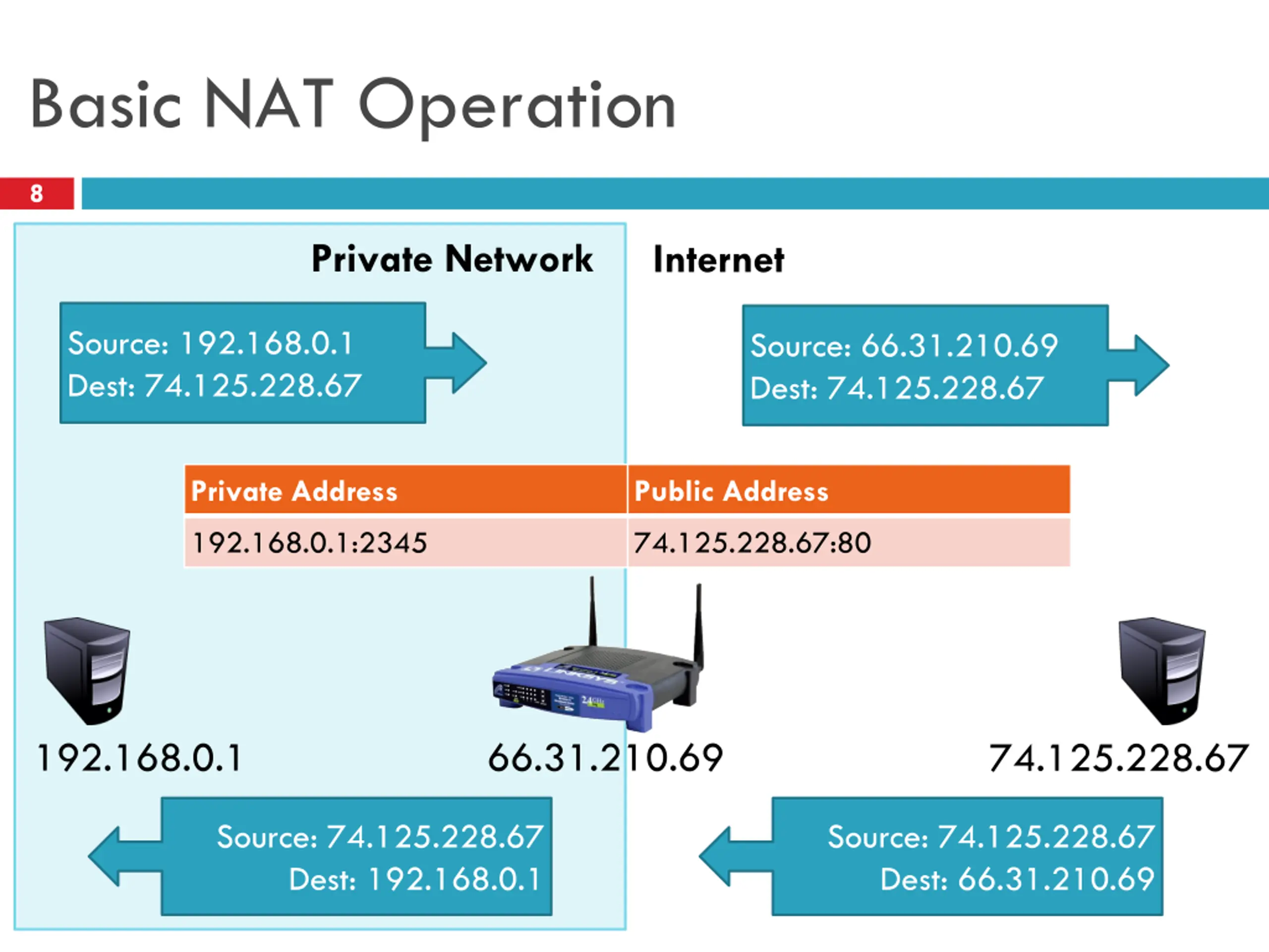 Basic NAT Operation 8 Private Network Internet Source: 192.168.0.1 Dest: 74.125.228.67 Source: 66.31.210.69 Dest: 74.125.228.67 Private Address Public Address 192.168.0.1:2345 74.125.228.67:80 192.168.0.1 66.31.210.69 74.125.228.67 Source: 74.125.228.67 Dest: 192.168.0.1 Source: 74.125.228.67 Dest: 66.31.210.69