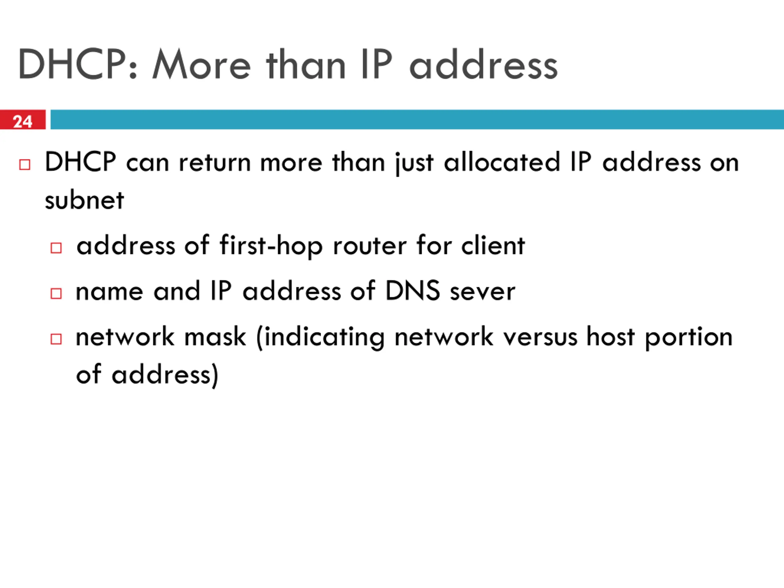 DHCP: More than IP address 24 DHCP can return more than just allocated IP address on subnet address of first-hop router for client name and IP address of DNS sever network mask (indicating network versus host portion of address)
