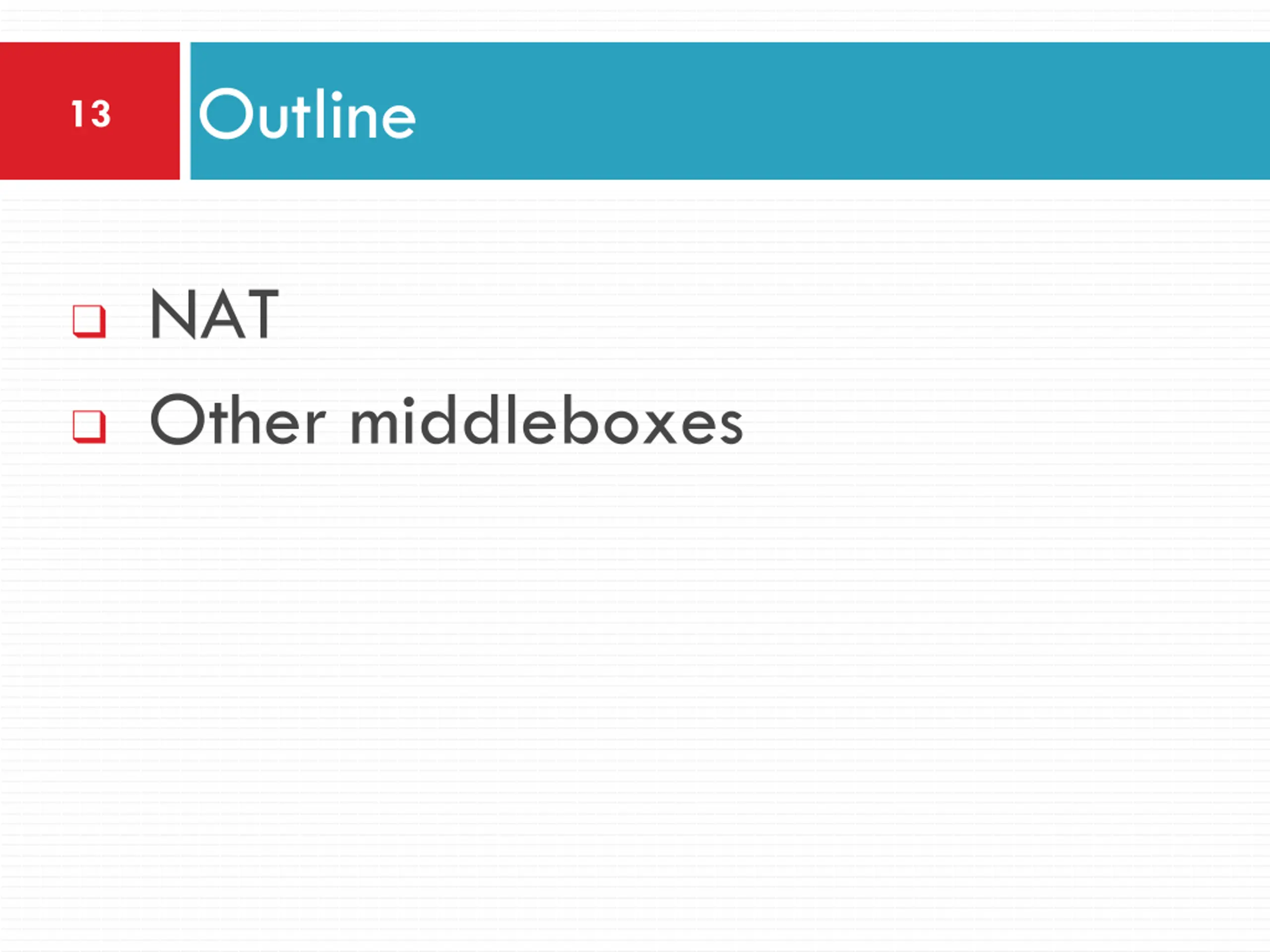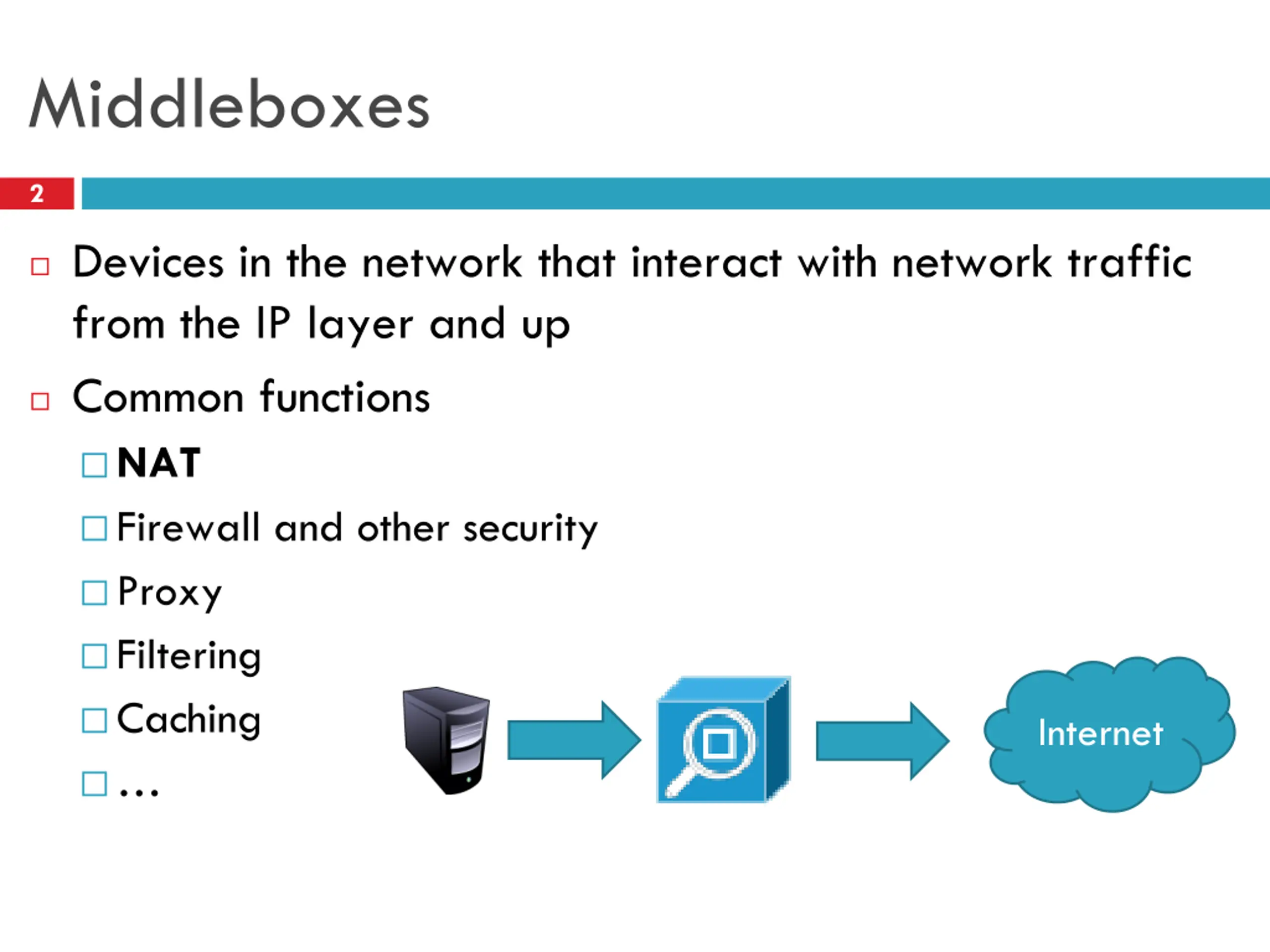 Middleboxes 2 Devices in the network that interact with network traffic from the IP layer and up Common functions NAT Firewall and other security Proxy Filtering Caching Internet