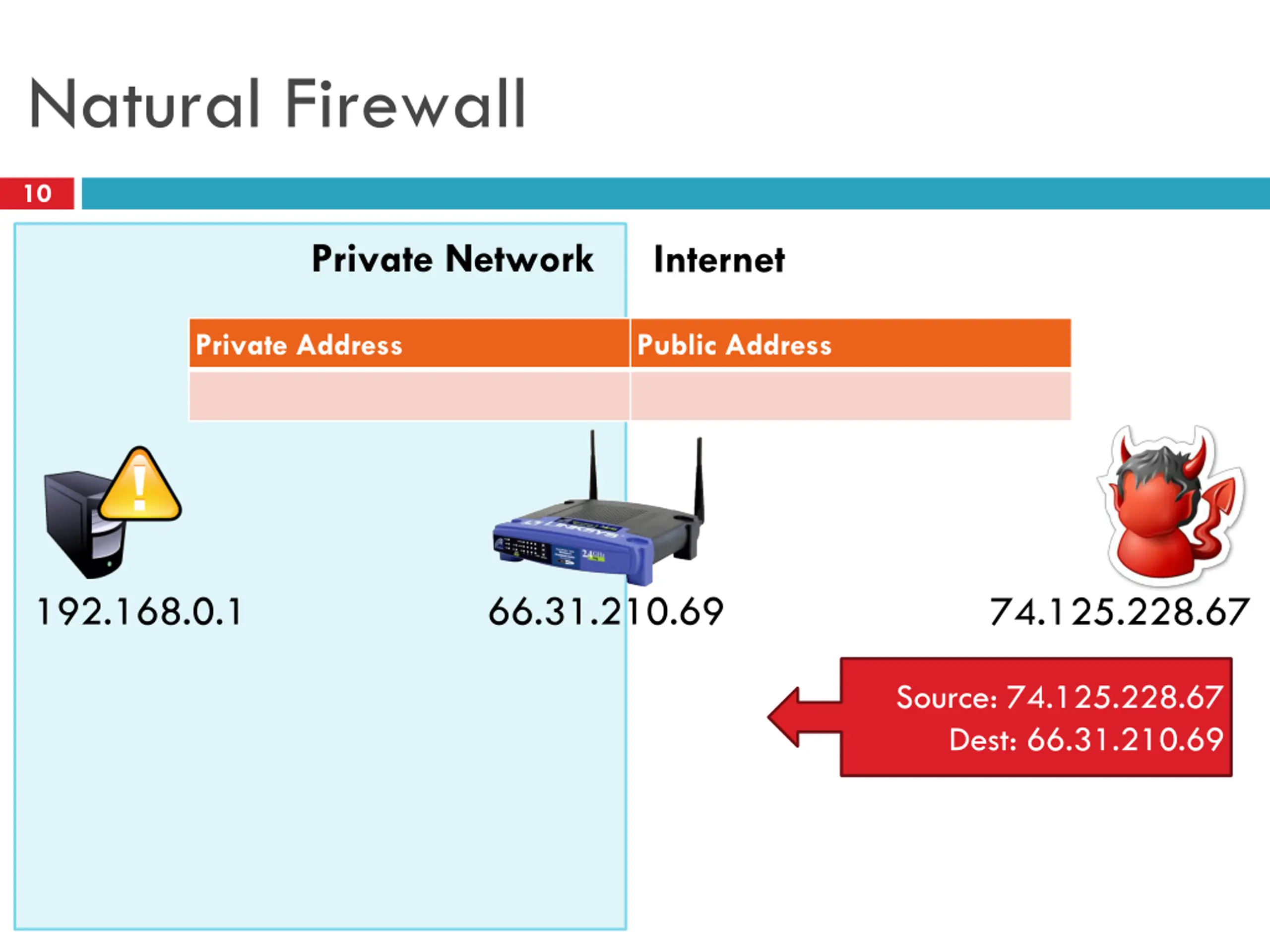 Natural Firewall 10 Private Network Internet Private Address Public Address 192.168.0.1 66.31.210.69 74.125.228.67 Source: 74.125.228.67 Source: 74.125.228.67 Dest: 192.168.0.1 Dest: 66.31.210.69