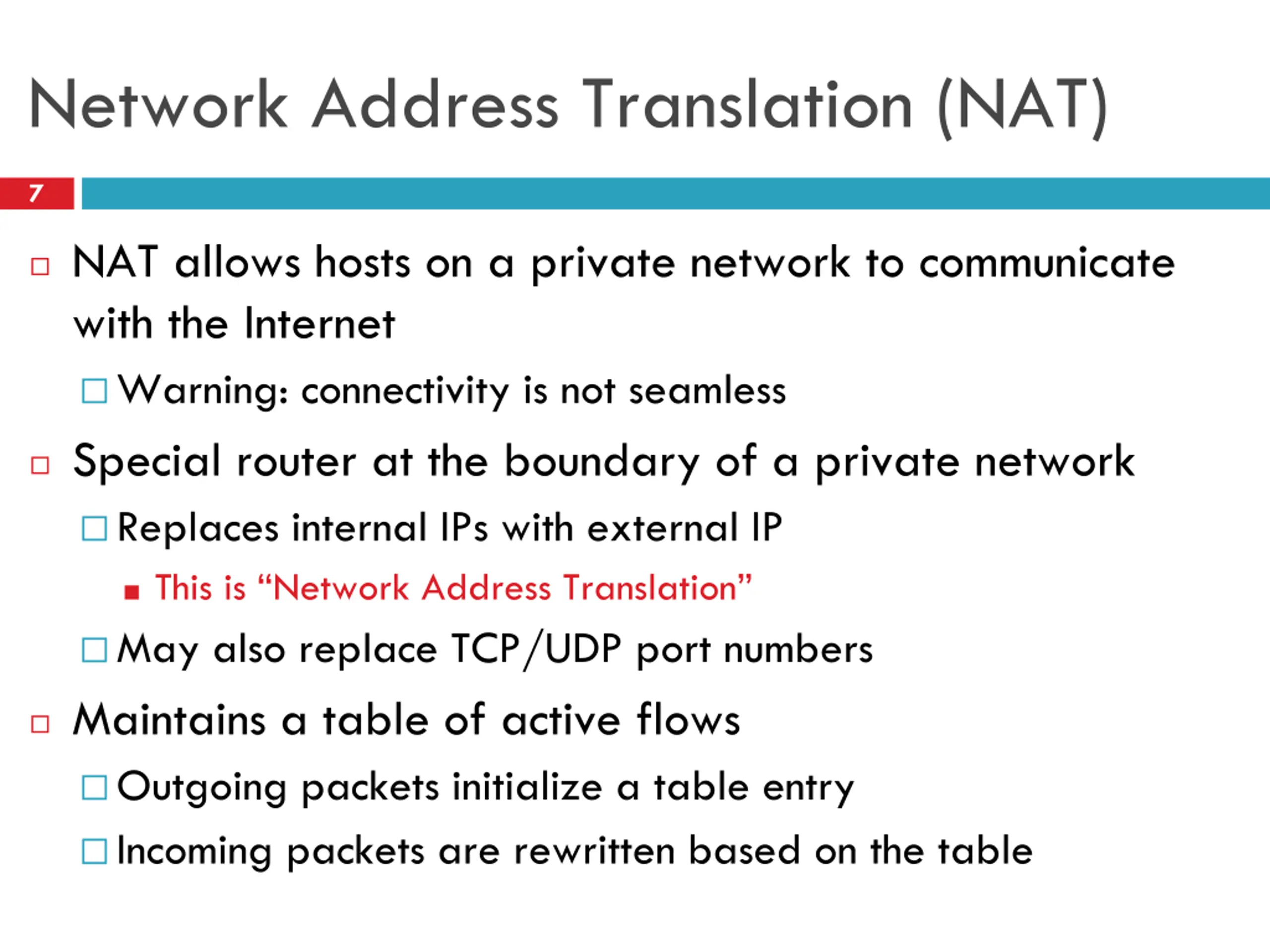 Network Address Translation (NAT) 7 NAT allows hosts on a private network to communicate with the Internet Warning: connectivity is not seamless Special router at the boundary of a private network Replaces internal IPs with external IP This is Network Address Translation May also replace TCP/UDP port numbers Maintains a table of active flows Outgoing packets initialize a table entry Incoming packets are rewritten based on the table