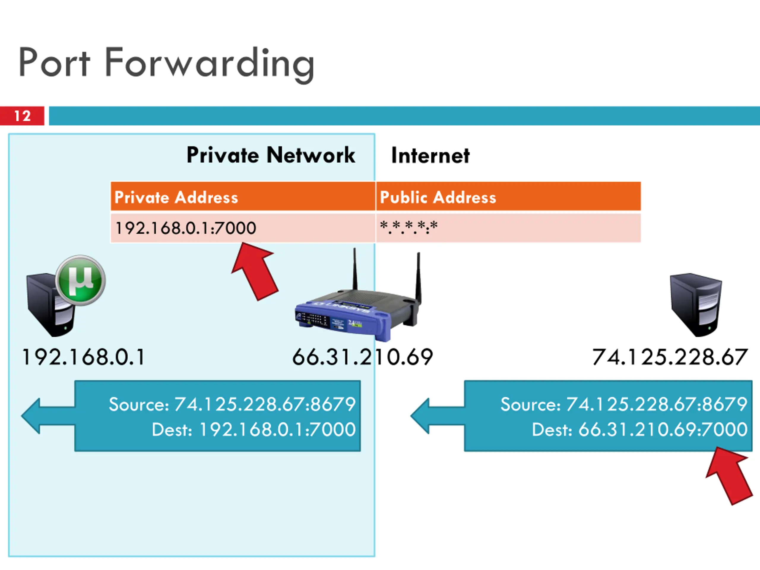 Port Forwarding 12 Private Network Internet Private Address Public Address 192.168.0.1:7000 *.*.*.*:* 192.168.0.1 66.31.210.69 74.125.228.67 Source: 74.125.228.67:8679 Dest: 192.168.0.1:7000 Source: 74.125.228.67:8679 Dest: 66.31.210.69:7000