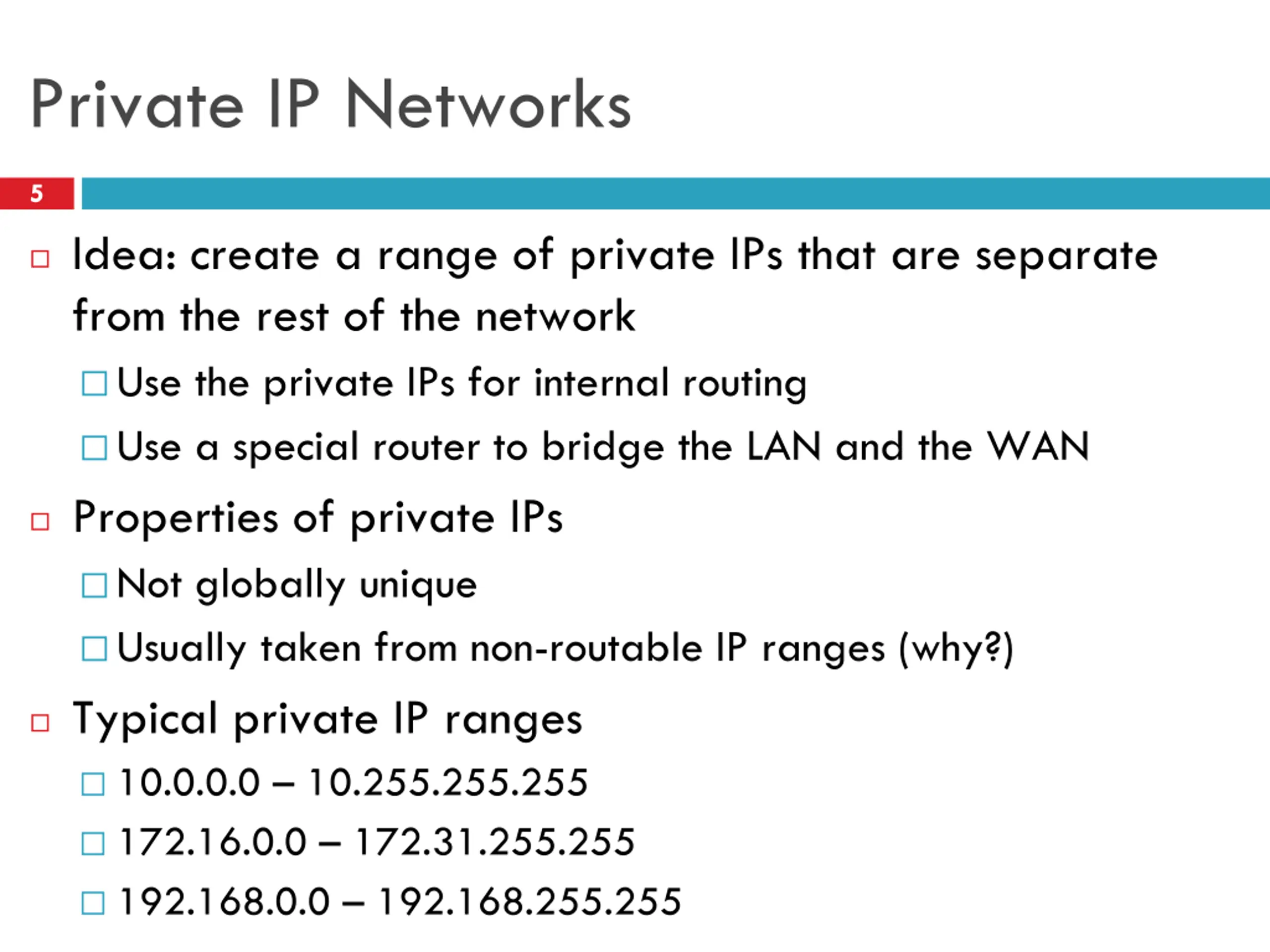 Private IP Networks 5 Idea: create a range of private IPs that are separate from the rest of the network Use the private IPs for internal routing Use a special router to bridge the LAN and the WAN Properties of private IPs Not globally unique Usually taken from non-routable IP ranges (why?) Typical private IP ranges 10.0.0.0 10.255.255.255 172.16.0.0 172.31.255.255 192.168.0.0 192.168.255.255
