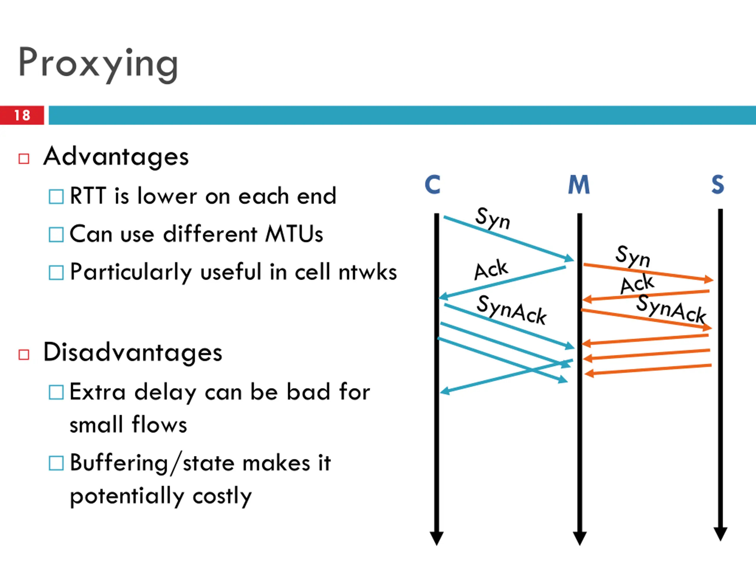 Proxying 18 Advantages RTT is lower on each end Can use different MTUs Particularly useful in cell ntwks C M S Disadvantages Extra delay can be bad for small flows Buffering/state makes it potentially costly