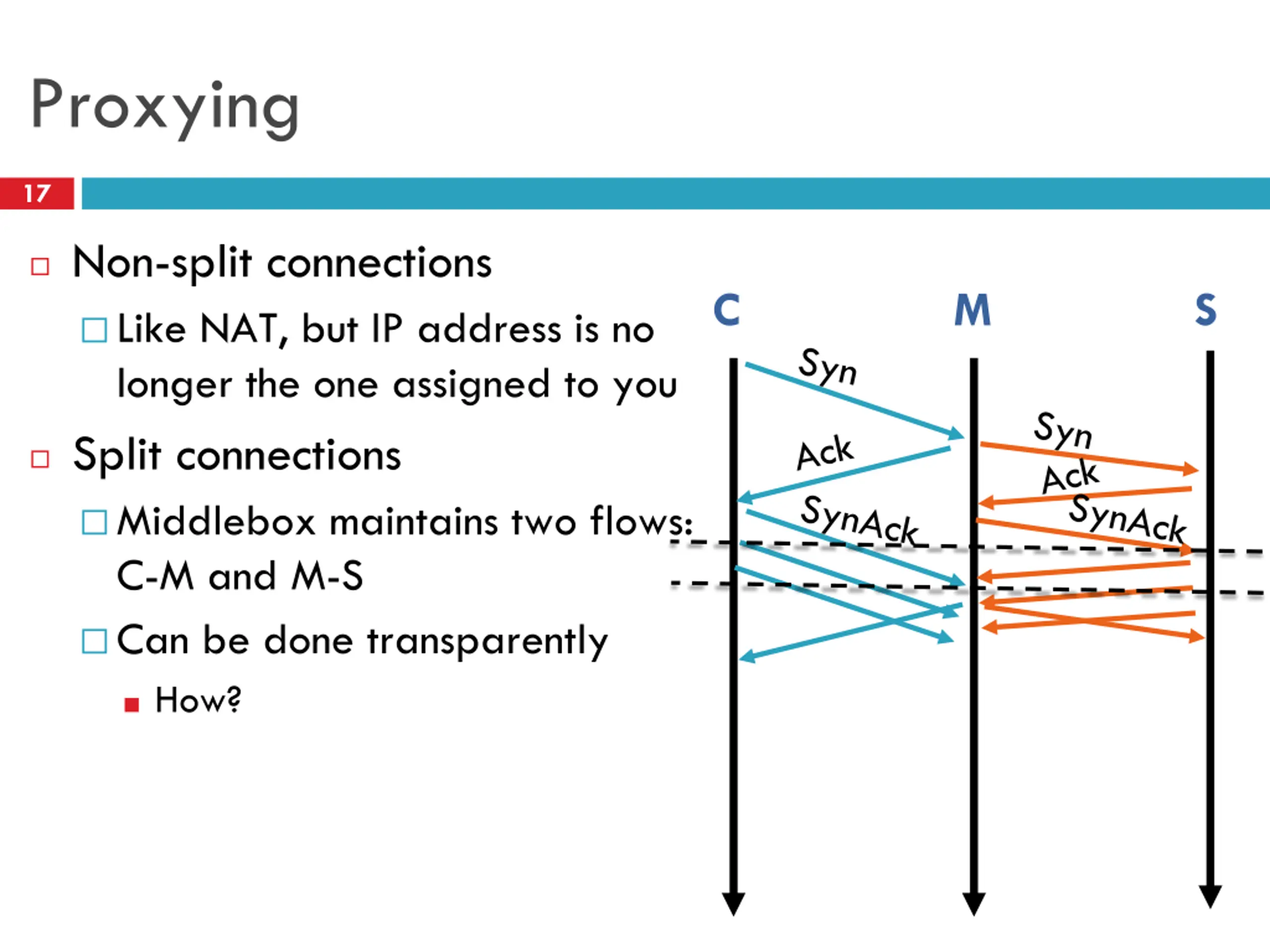 Proxying 17 Non-split connections Like NAT, but IP address is no longer the one assigned to you C M S Split connections Middlebox maintains two flows: C-M and M-S Can be done transparently How?