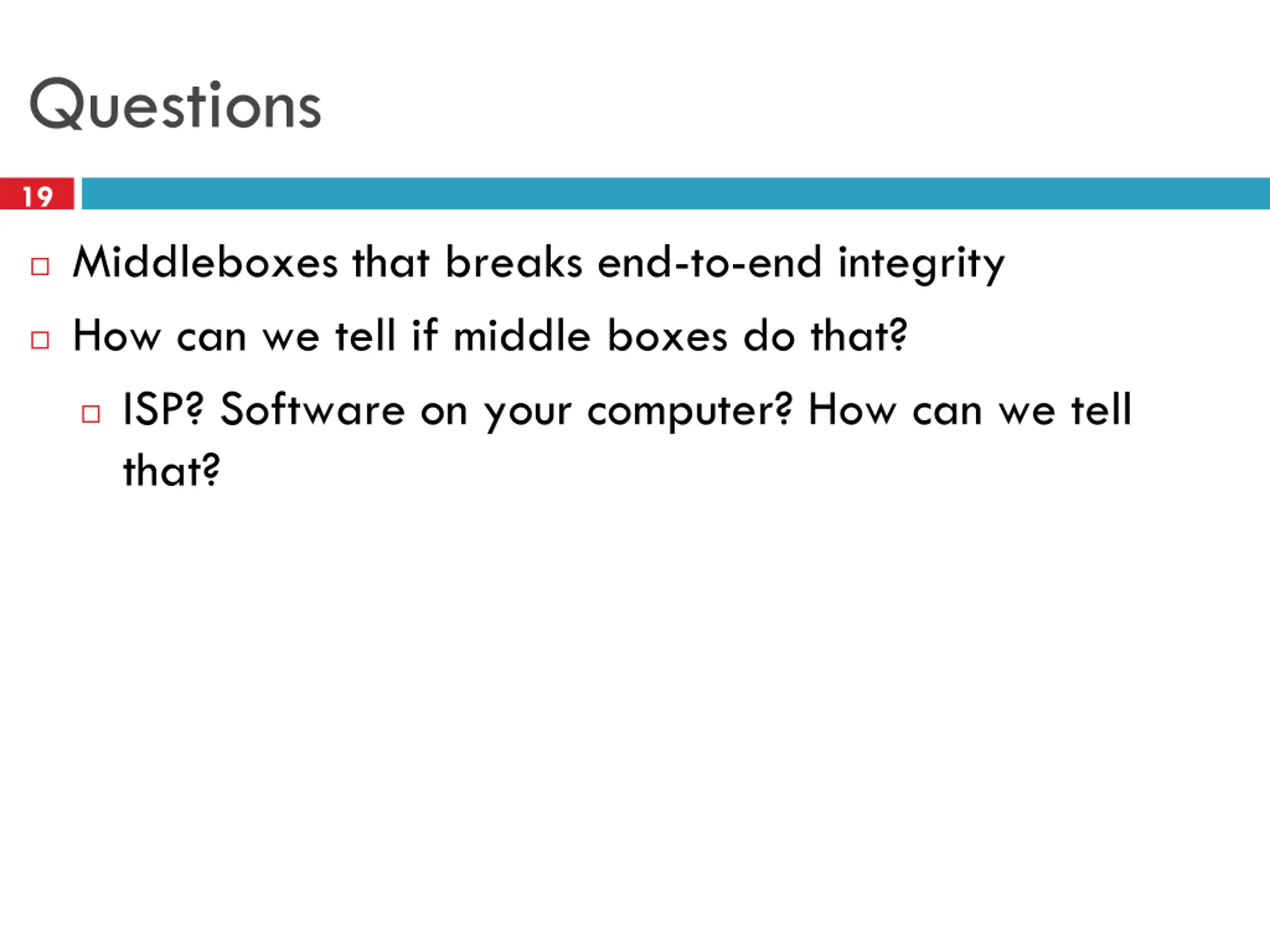 Questions 19 Middleboxes that breaks end-to-end integrity How can we tell if middle boxes do that? ISP? Software on your computer? How can we tell that?