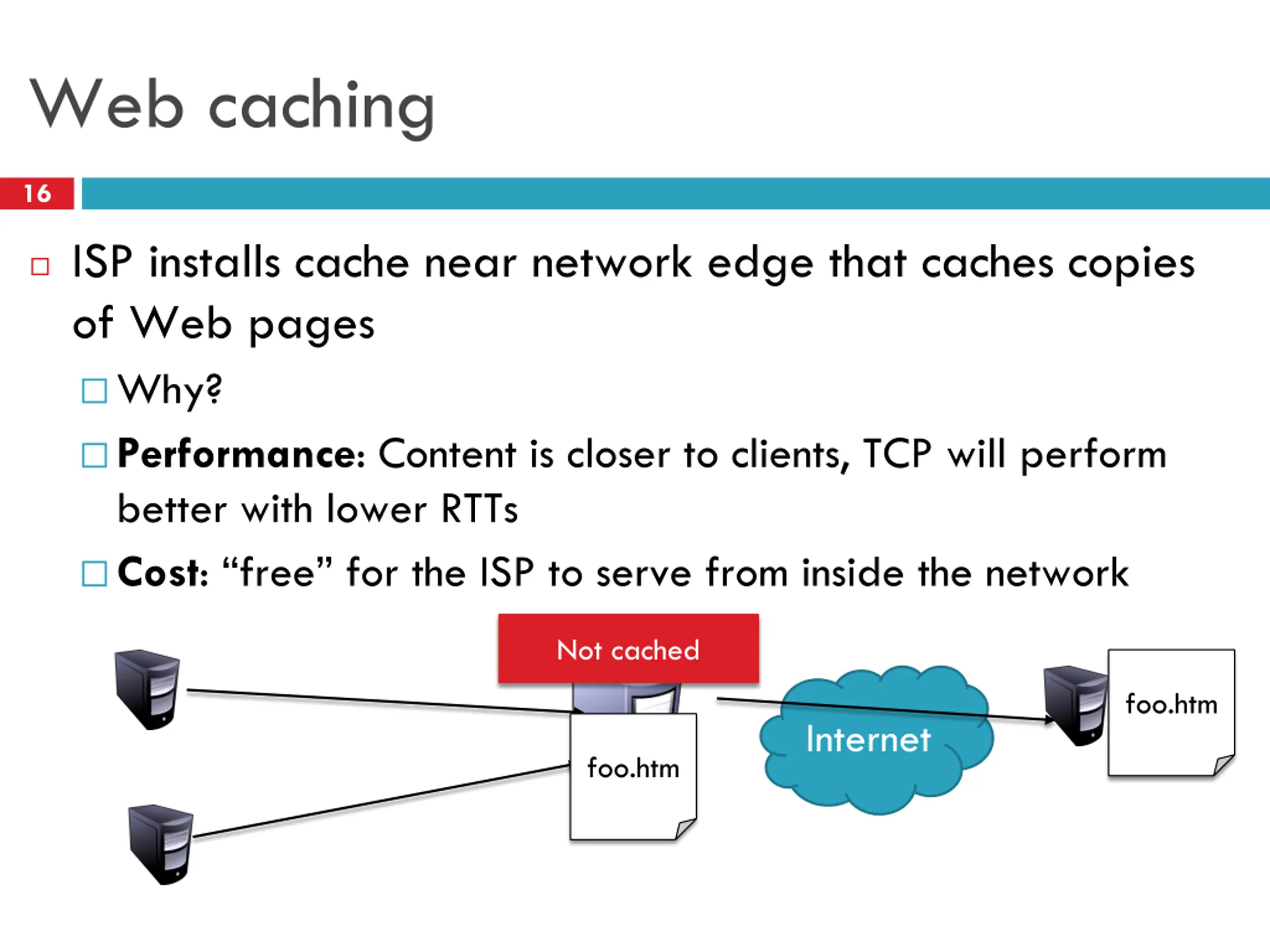 Web caching 15 ISP installs cache near network edge that caches copies of Web pages Why? Performance: Content is closer to clients, TCP will perform better with lower RTTs Cost: free for the ISP to serve from inside the network Limitations Much of today s content is not static (why does this matter?) Content ownership Potential privacy issues Long tail of content popularity