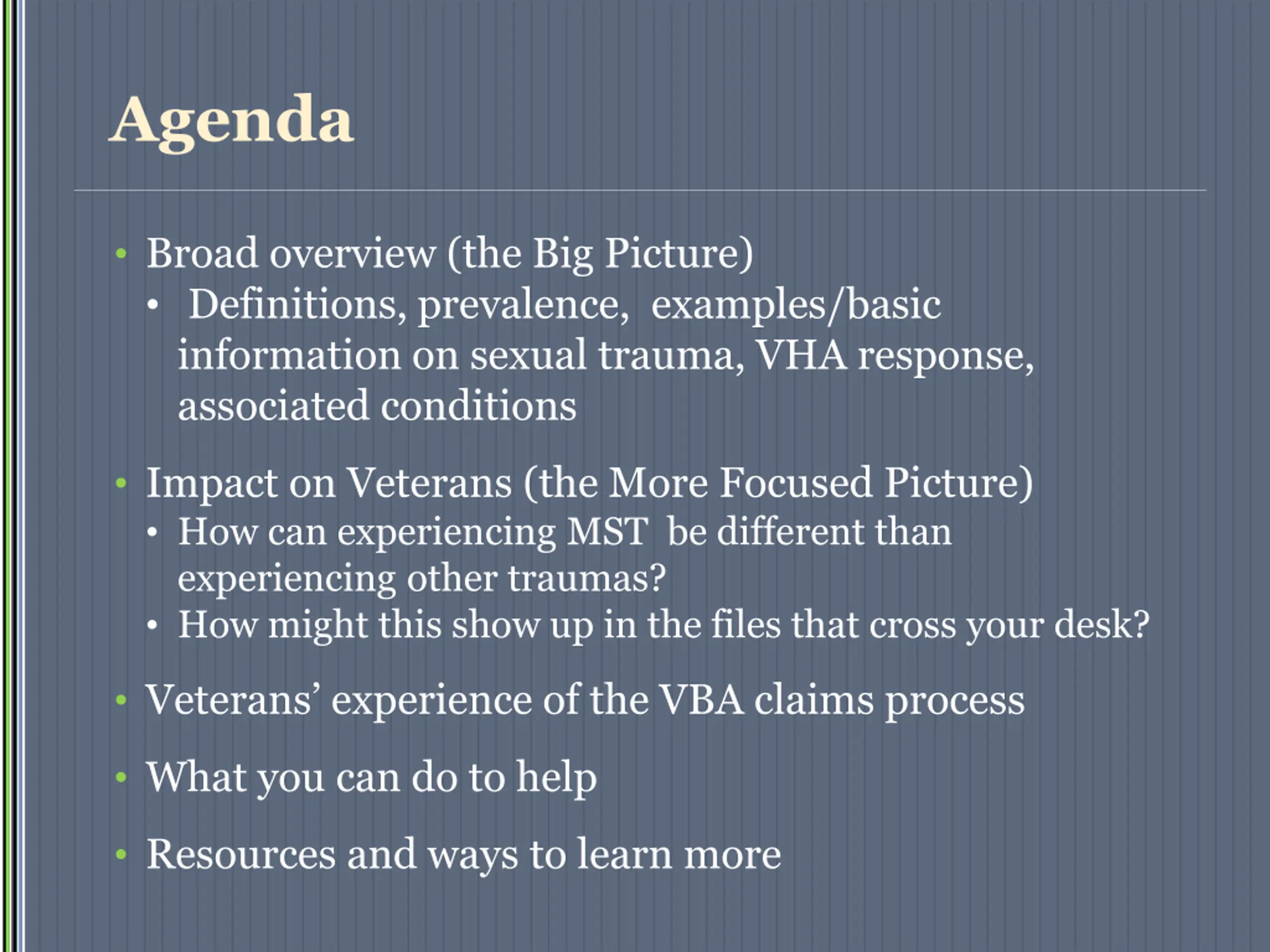 Agenda Broad overview (the Big Picture) Definitions, prevalence, examples/basic information on sexual trauma, VHA response, associated conditions Impact on Veterans (the More Focused Picture) How can experiencing MST be different than experiencing other traumas? How might this show up in the files that cross your desk? Veterans experience of the VBA claims process What you can do to help Resources and ways to learn more