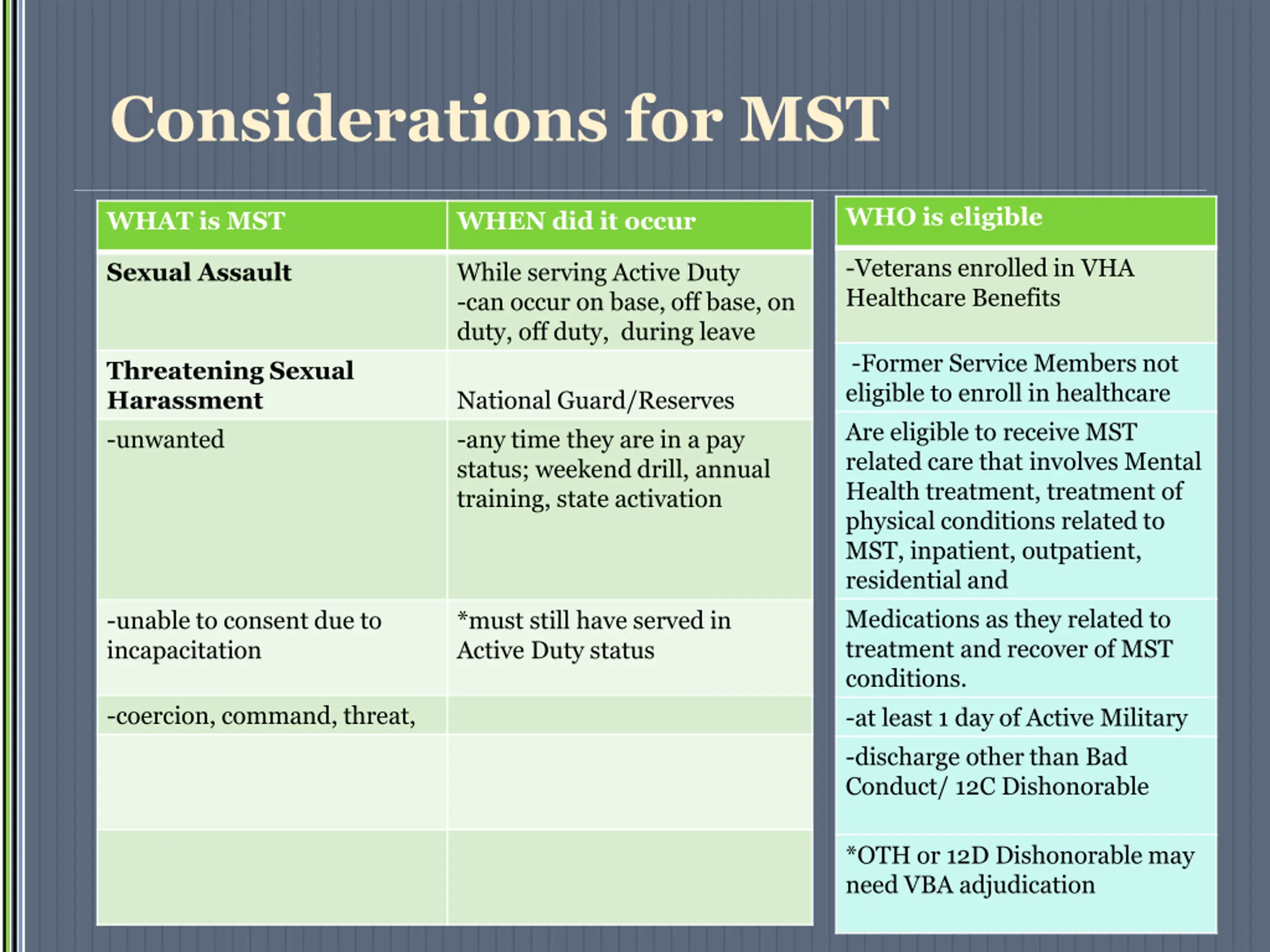 Considerations for MST WHO is eligible WHAT is MST WHEN did it occur -Veterans enrolled in VHA Healthcare Benefits Sexual Assault While serving Active Duty -can occur on base, off base, on duty, off duty, during leave -Former Service Members not eligible to enroll in healthcare Are eligible to receive MST related care that involves Mental Health treatment, treatment of physical conditions related to MST, inpatient, outpatient, residential and Medications as they related to treatment and recover of MST conditions. -at least 1 day of Active Military -discharge other than Bad Conduct/ 12C Dishonorable Threatening Sexual Harassment -unwanted National Guard/Reserves -any time they are in a pay status; weekend drill, annual training, state activation -unable to consent due to incapacitation *must still have served in Active Duty status -coercion, command, threat, *OTH or 12D Dishonorable may need VBA adjudication