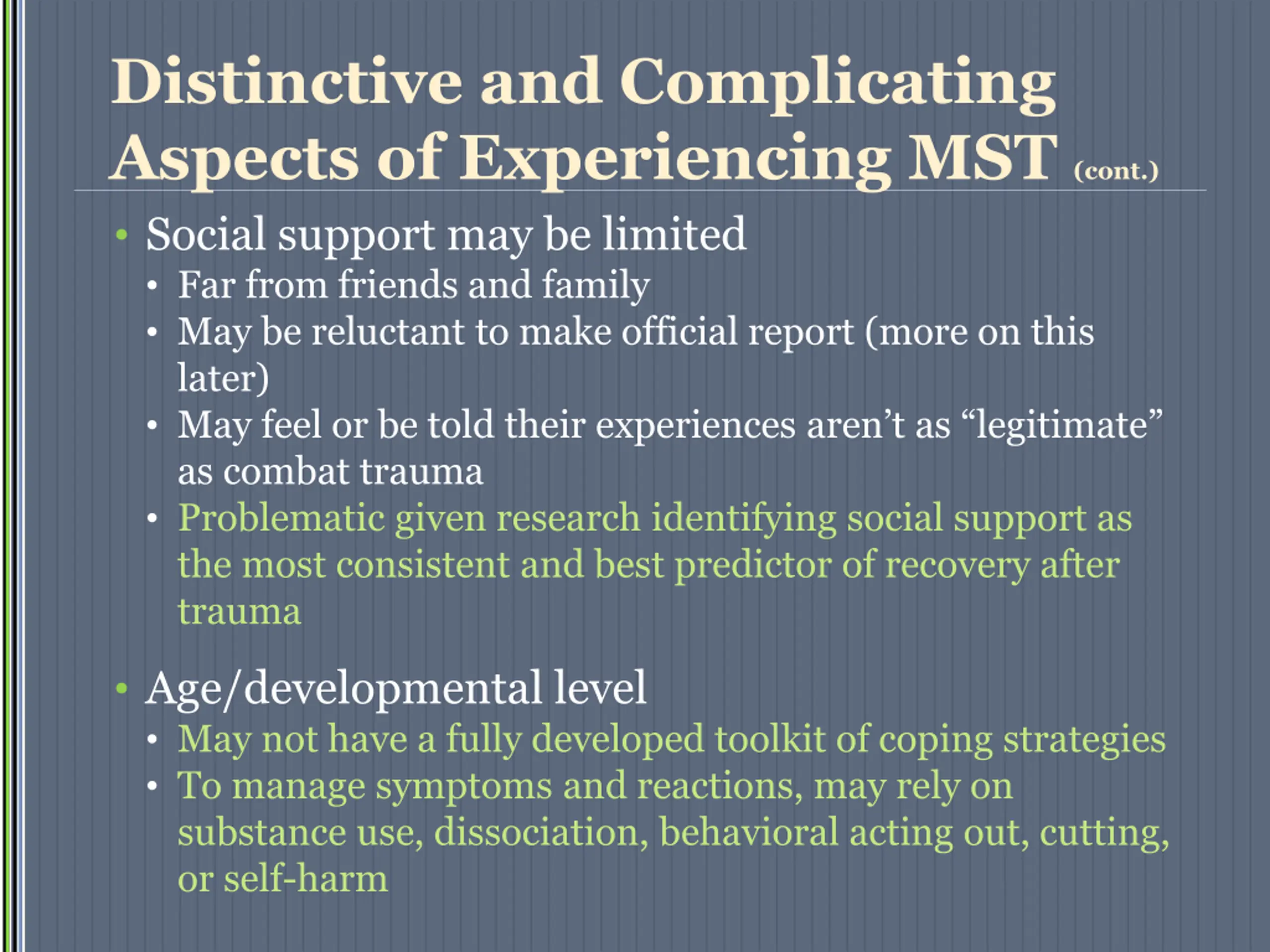 Distinctive and Complicating Aspects of Experiencing MST (cont.) Social support may be limited Far from friends and family May be reluctant to make official report (more on this later) May feel or be told their experiences aren t as legitimate as combat trauma Problematic given research identifying social support as the most consistent and best predictor of recovery after trauma Age/developmental level May not have a fully developed toolkit of coping strategies To manage symptoms and reactions, may rely on substance use, dissociation, behavioral acting out, cutting, or self-harm