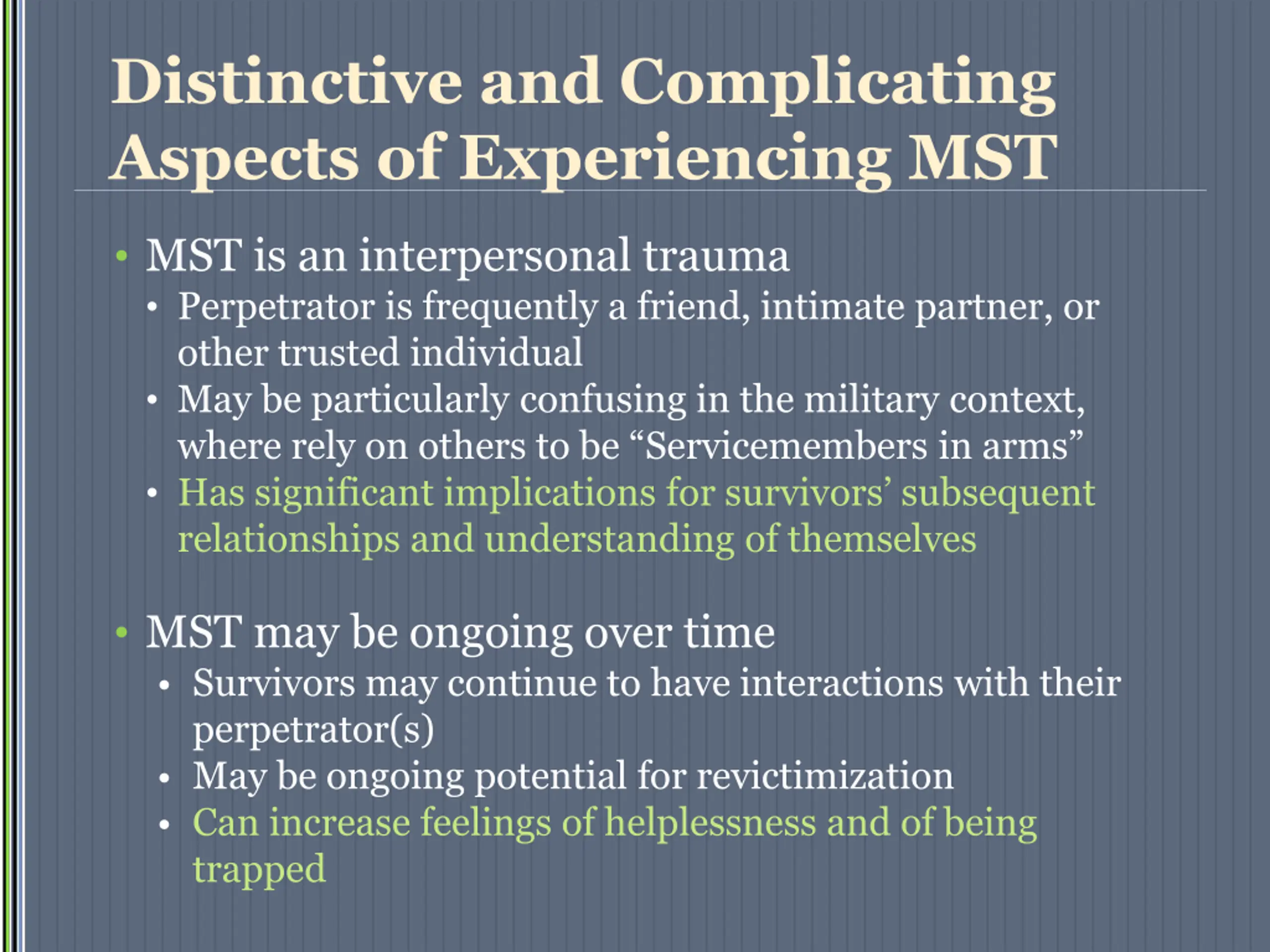 Distinctive and Complicating Aspects of Experiencing MST MST is an interpersonal trauma Perpetrator is frequently a friend, intimate partner, or other trusted individual May be particularly confusing in the military context, where rely on others to be Servicemembers in arms Has significant implications for survivors subsequent relationships and understanding of themselves MST may be ongoing over time Survivors may continue to have interactions with their perpetrator(s) May be ongoing potential for revictimization Can increase feelings of helplessness and of being trapped