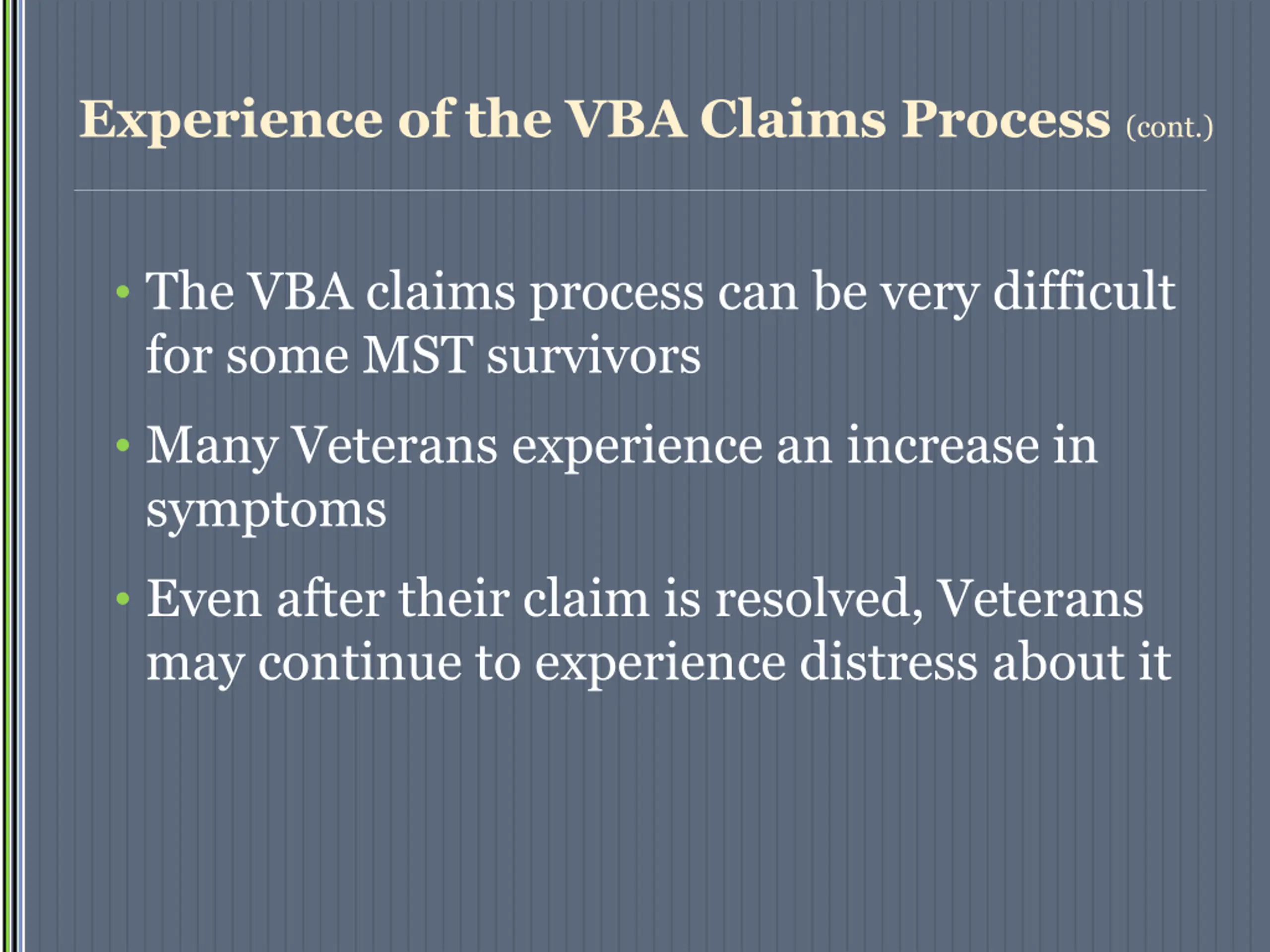 Experience of the VBA Claims Process (cont.) The VBA claims process can be very difficult for some MST survivors Many Veterans experience an increase in symptoms Even after their claim is resolved, Veterans may continue to experience distress about it