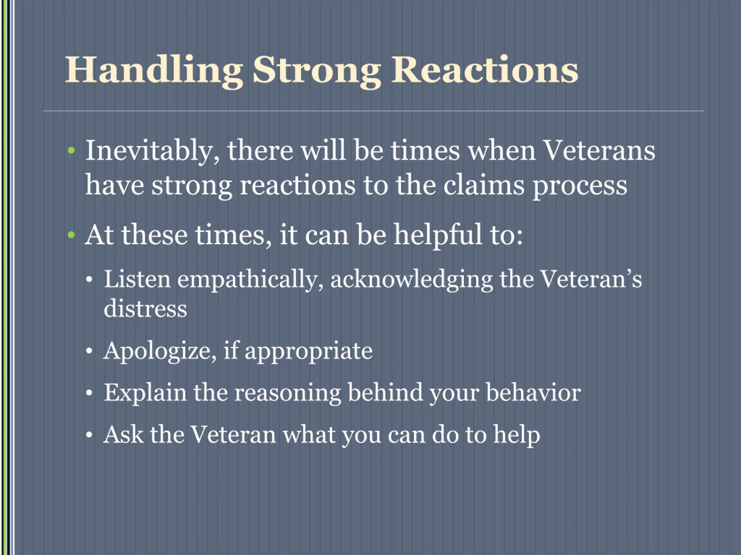 Handling Strong Reactions Inevitably, there will be times when Veterans have strong reactions to the claims process At these times, it can be helpful to: Listen empathically, acknowledging the Veteran s distress Apologize, if appropriate Explain the reasoning behind your behavior Ask the Veteran what you can do to help