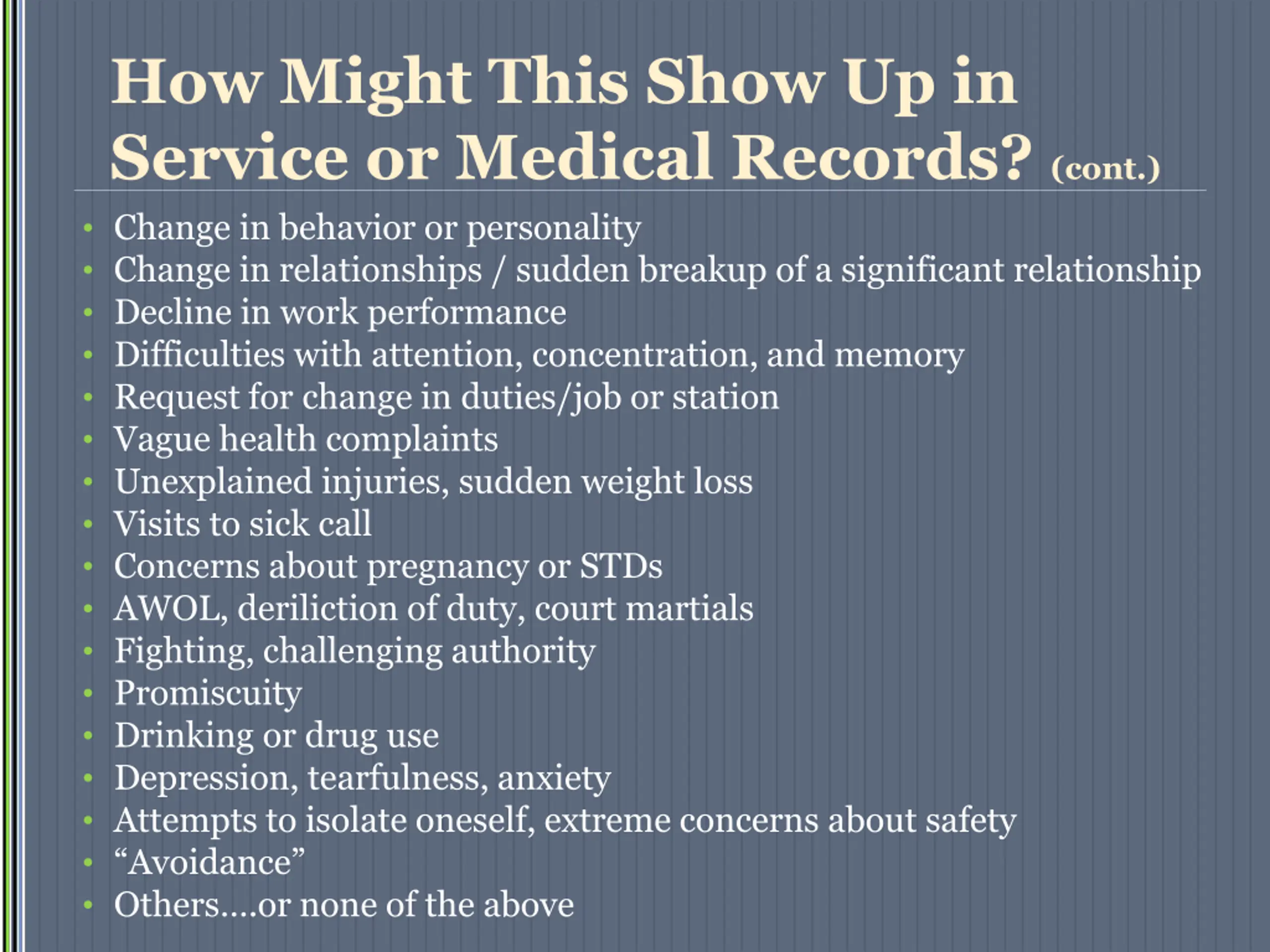How Might This Show Up in Service or Medical Records? (cont.) Change in behavior or personality Change in relationships / sudden breakup of a significant relationship Decline in work performance Difficulties with attention, concentration, and memory Request for change in duties/job or station Vague health complaints Unexplained injuries, sudden weight loss Visits to sick call Concerns about pregnancy or STDs AWOL, deriliction of duty, court martials Fighting, challenging authority Promiscuity Drinking or drug use Depression, tearfulness, anxiety Attempts to isolate oneself, extreme concerns about safety Avoidance Others .or none of the above