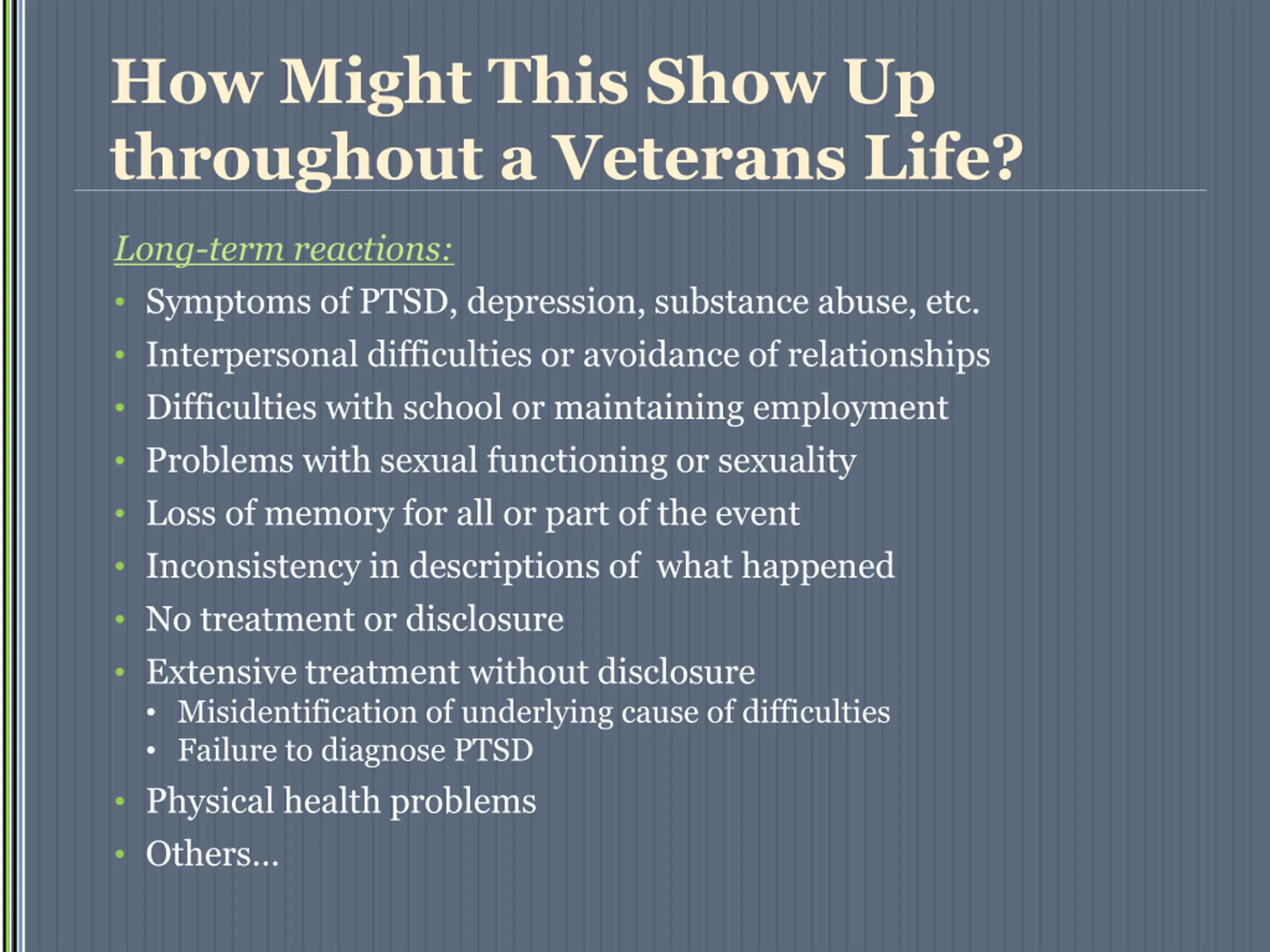 How Might This Show Up throughout a Veterans Life? Long-term reactions: Symptoms of PTSD, depression, substance abuse, etc. Interpersonal difficulties or avoidance of relationships Difficulties with school or maintaining employment Problems with sexual functioning or sexuality Loss of memory for all or part of the event Inconsistency in descriptions of what happened No treatment or disclosure Extensive treatment without disclosure Misidentification of underlying cause of difficulties Failure to diagnose PTSD Physical health problems Others