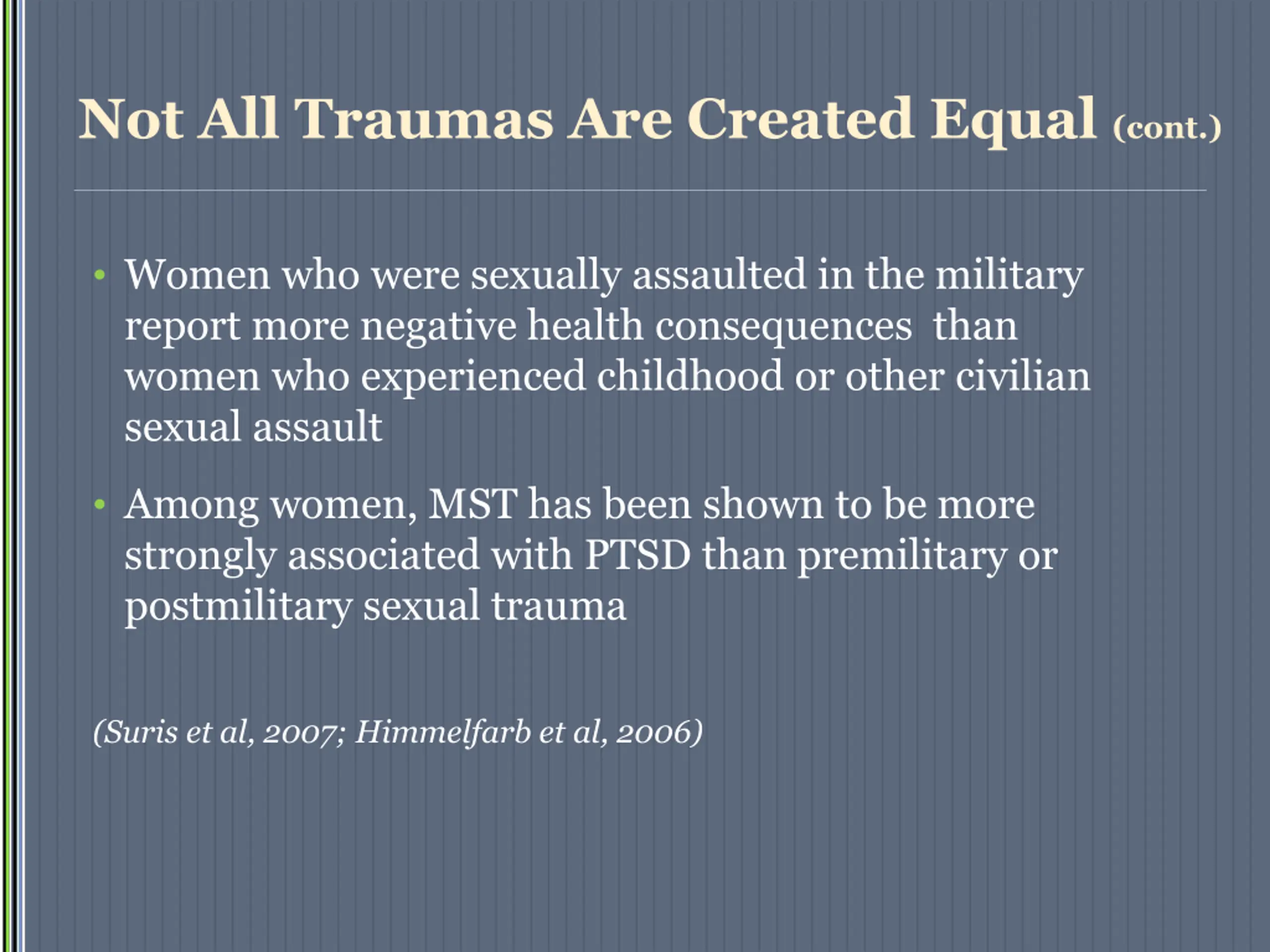 Not All Traumas Are Created Equal (cont.) Women who were sexually assaulted in the military report more negative health consequences than women who experienced childhood or other civilian sexual assault Among women, MST has been shown to be more strongly associated with PTSD than premilitary or postmilitary sexual trauma (Suris et al, 2007; Himmelfarb et al, 2006)