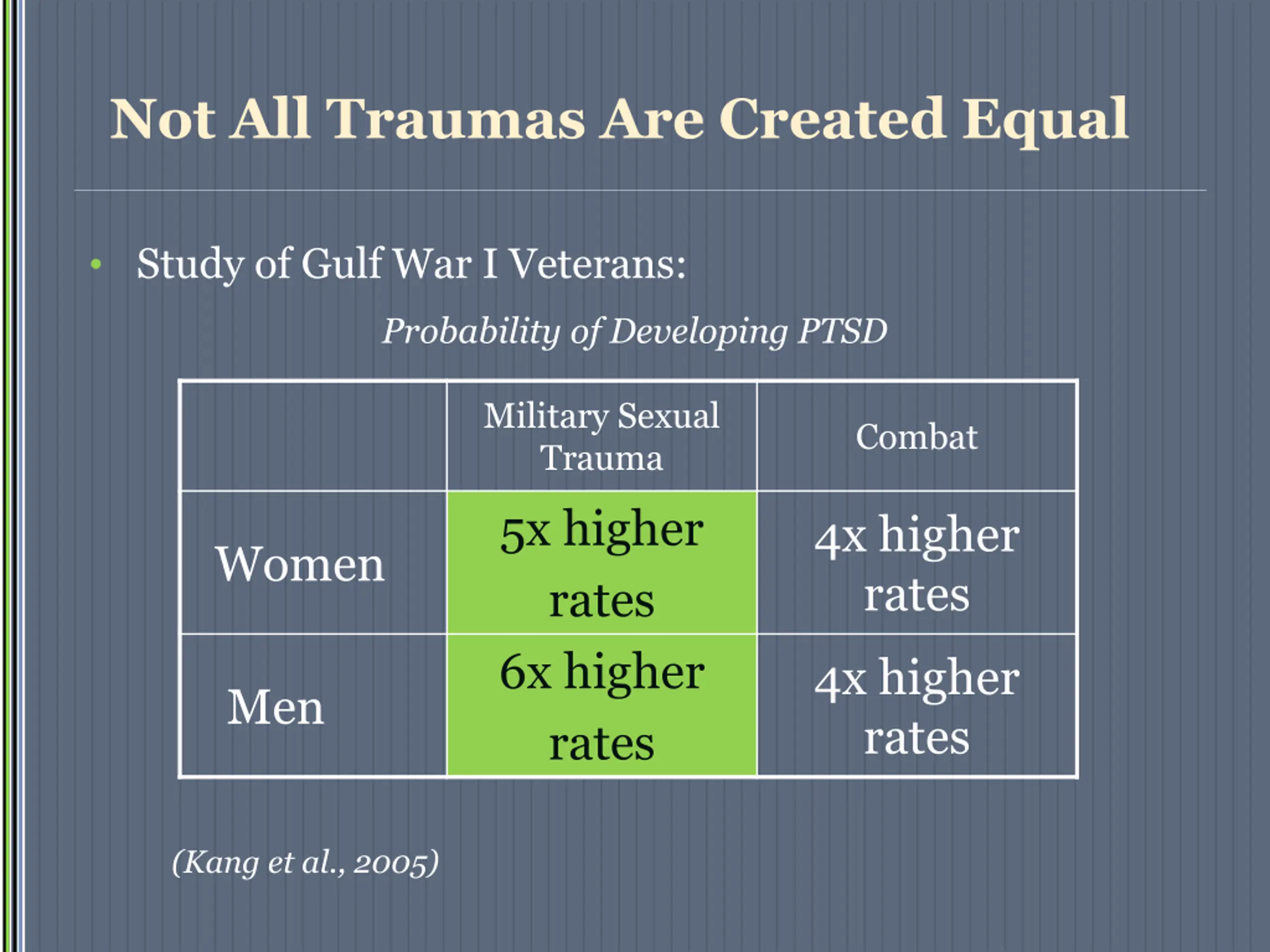 Not All Traumas Are Created Equal Study of Gulf War I Veterans: Probability of Developing PTSD Military Sexual Trauma 5x higher rates 6x higher rates Combat 4x higher rates Women 4x higher rates Men (Kang et al., 2005)