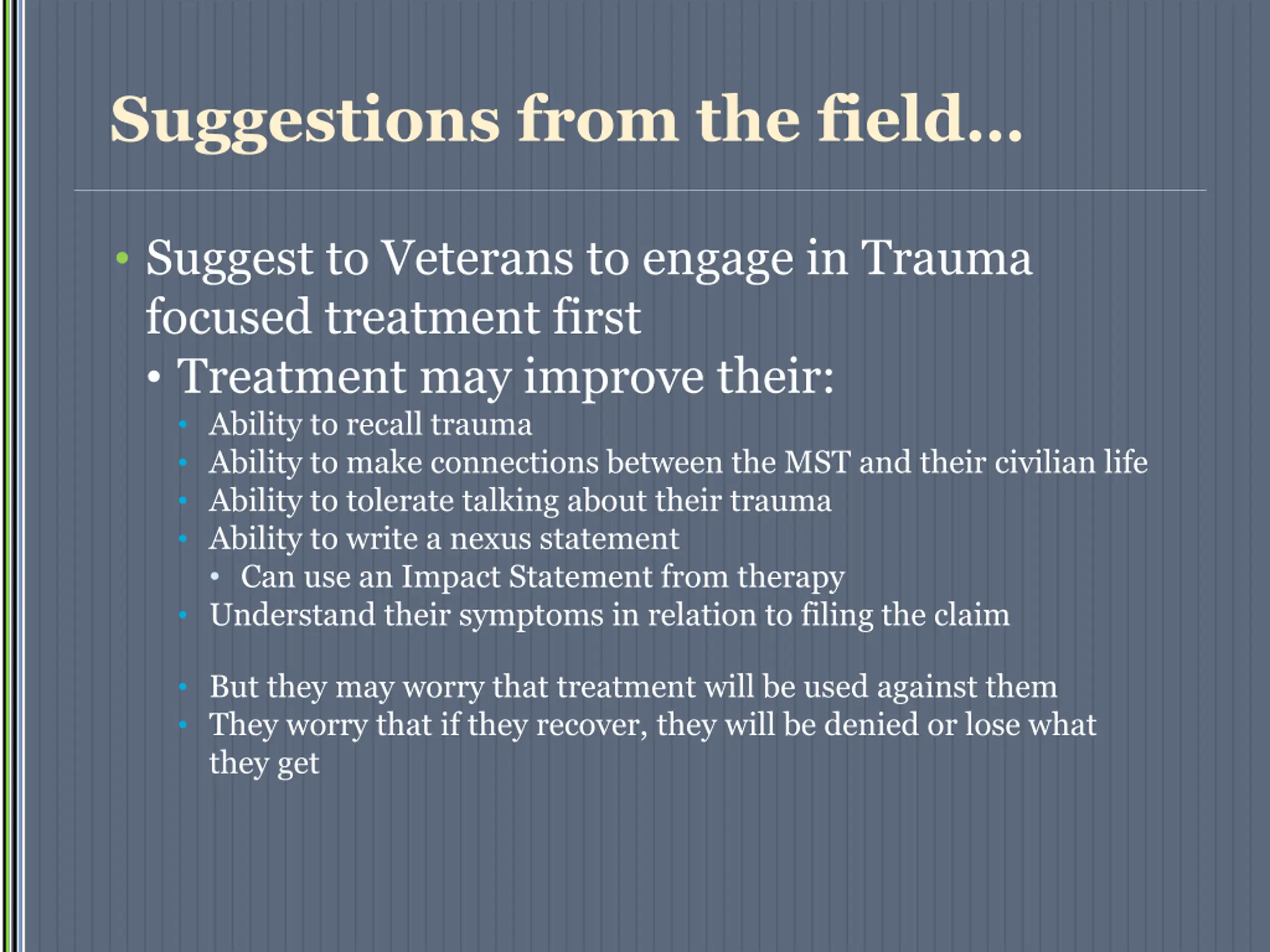 Suggestions from the field Suggest to Veterans to engage in Trauma focused treatment first Treatment may improve their: Ability to recall trauma Ability to make connections between the MST and their civilian life Ability to tolerate talking about their trauma Ability to write a nexus statement Can use an Impact Statement from therapy Understand their symptoms in relation to filing the claim But they may worry that treatment will be used against them They worry that if they recover, they will be denied or lose what they get