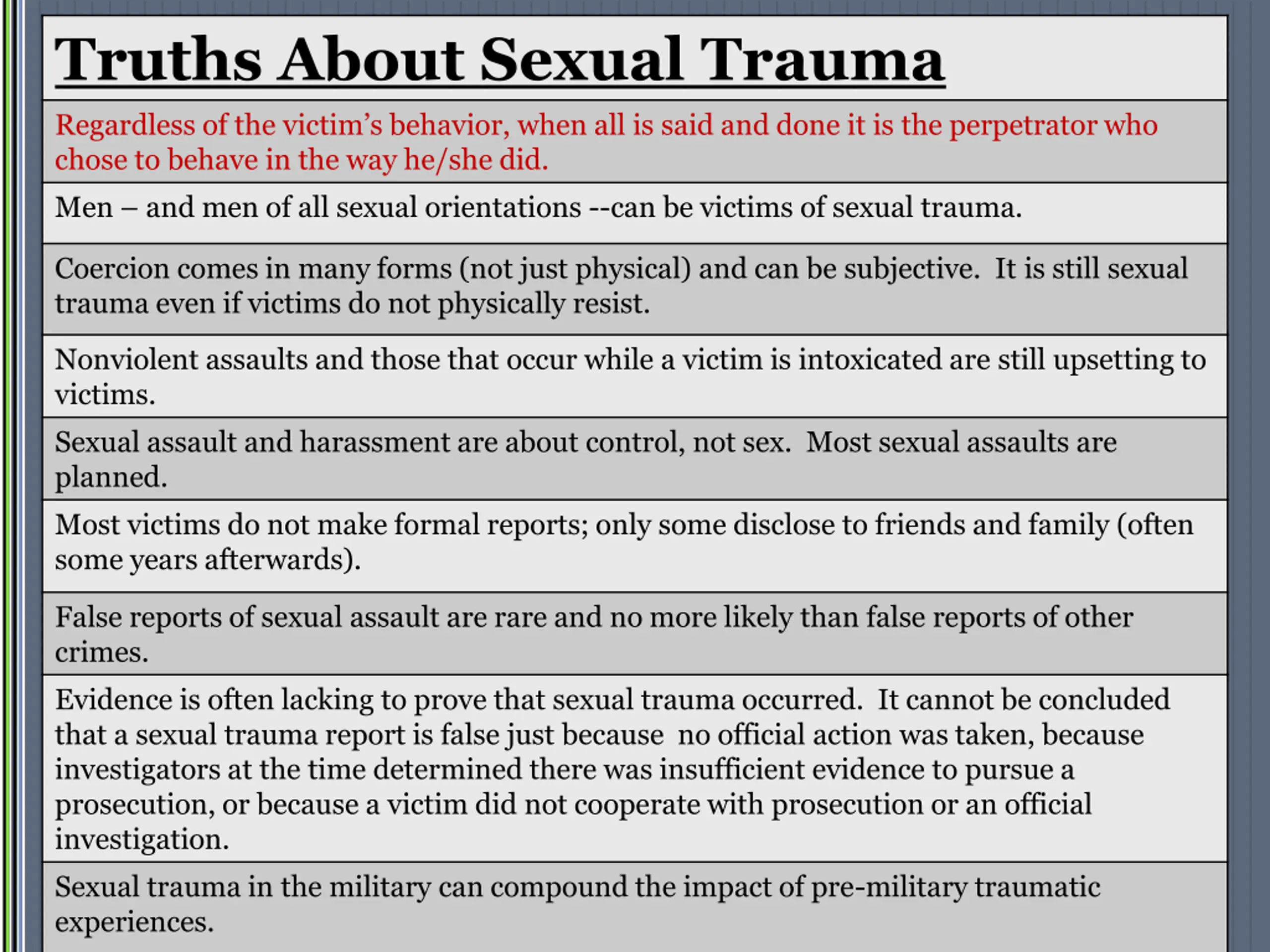 Truths About Sexual Trauma Regardless of the victim s behavior, when all is said and done it is the perpetrator who chose to behave in the way he/she did. Men and men of all sexual orientations --can be victims of sexual trauma. Coercion comes in many forms (not just physical) and can be subjective. It is still sexual trauma even if victims do not physically resist. Nonviolent assaults and those that occur while a victim is intoxicated are still upsetting to victims. Sexual assault and harassment are about control, not sex. Most sexual assaults are planned. Most victims do not make formal reports; only some disclose to friends and family (often some years afterwards). False reports of sexual assault are rare and no more likely than false reports of other crimes. Evidence is often lacking to prove that sexual trauma occurred. It cannot be concluded that a sexual trauma report is false just because no official action was taken, because investigators at the time determined there was insufficient evidence to pursue a prosecution, or because a victim did not cooperate with prosecution or an official investigation. Sexual trauma in the military can compound the impact of pre-military traumatic experiences.