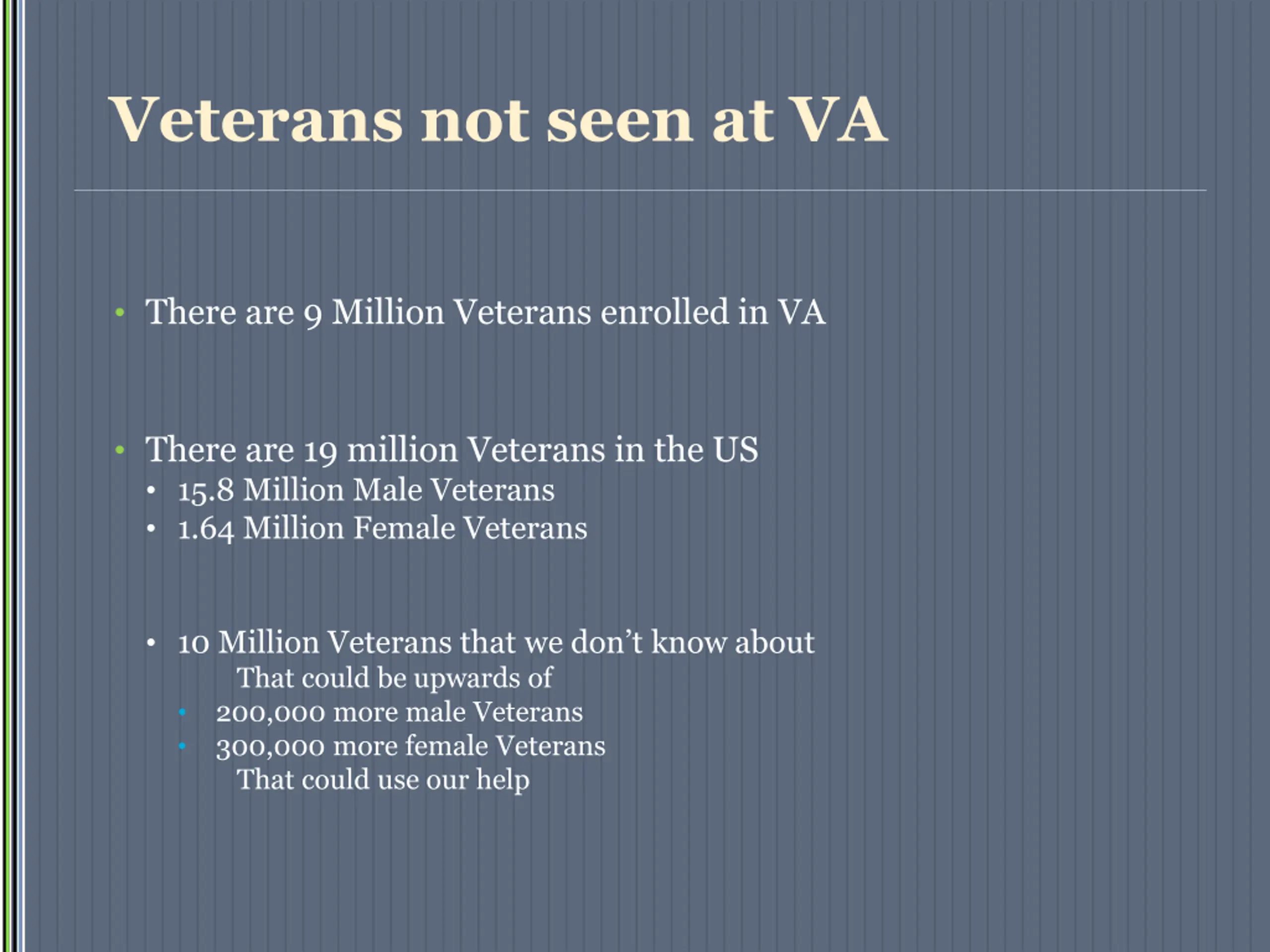 Veterans not seen at VA There are 9 Million Veterans enrolled in VA There are 19 million Veterans in the US 15.8 Million Male Veterans 1.64 Million Female Veterans 10 Million Veterans that we don t know about That could be upwards of 200,000 more male Veterans 300,000 more female Veterans That could use our help