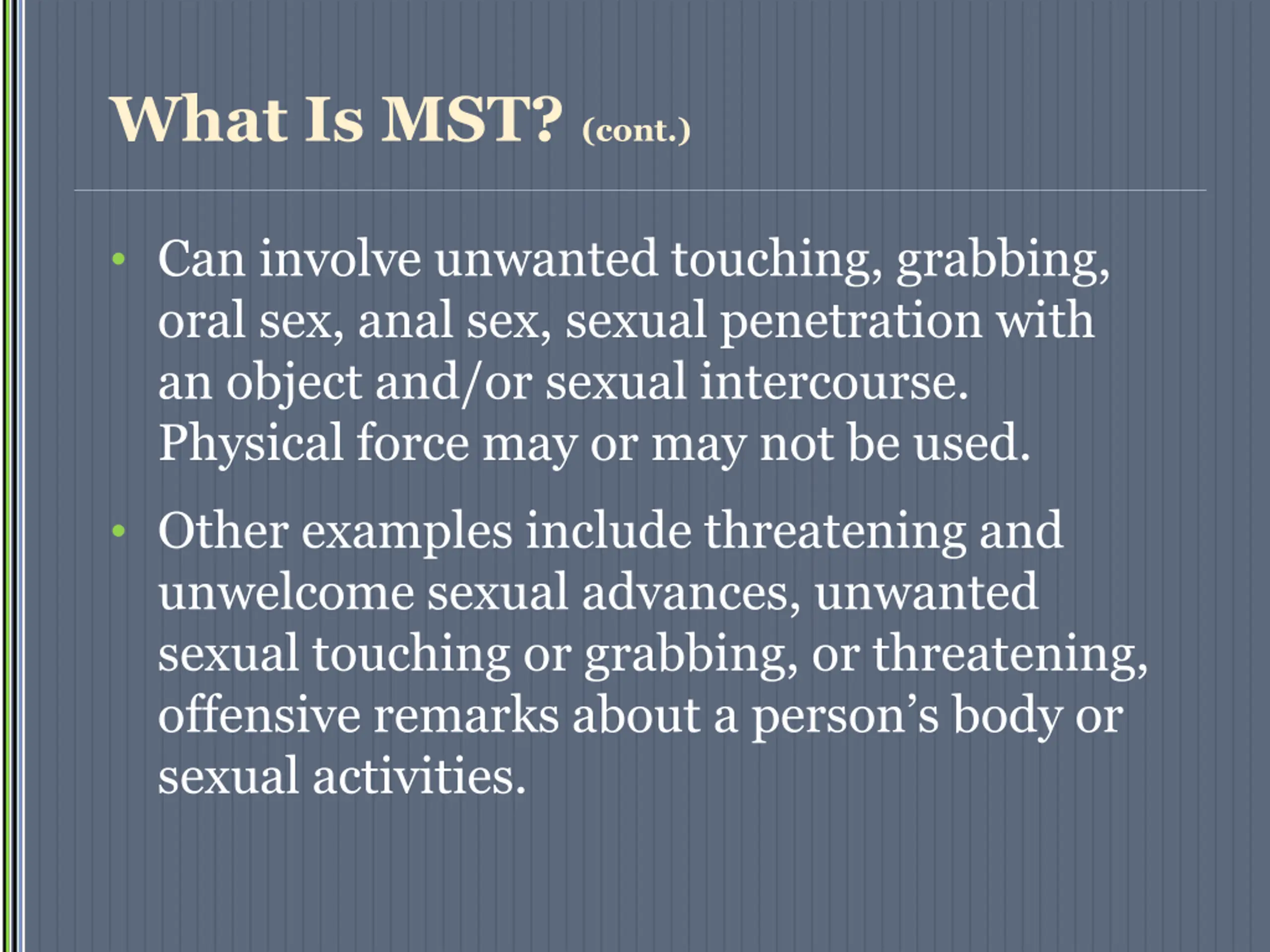What Is MST? (cont.) Can involve unwanted touching, grabbing, oral sex, anal sex, sexual penetration with an object and/or sexual intercourse. Physical force may or may not be used. Other examples include threatening and unwelcome sexual advances, unwanted sexual touching or grabbing, or threatening, offensive remarks about a person s body or sexual activities.