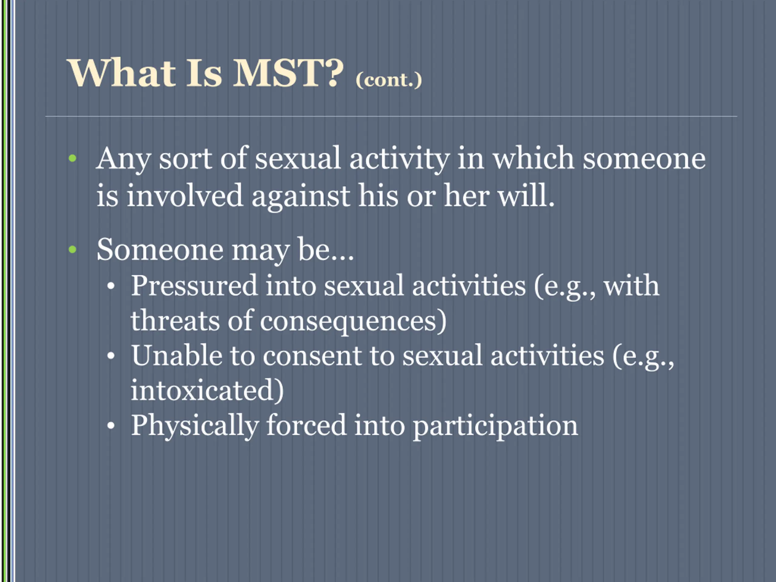What Is MST? (cont.) Any sort of sexual activity in which someone is involved against his or her will. Someone may be Pressured into sexual activities (e.g., with threats of consequences) Unable to consent to sexual activities (e.g., intoxicated) Physically forced into participation
