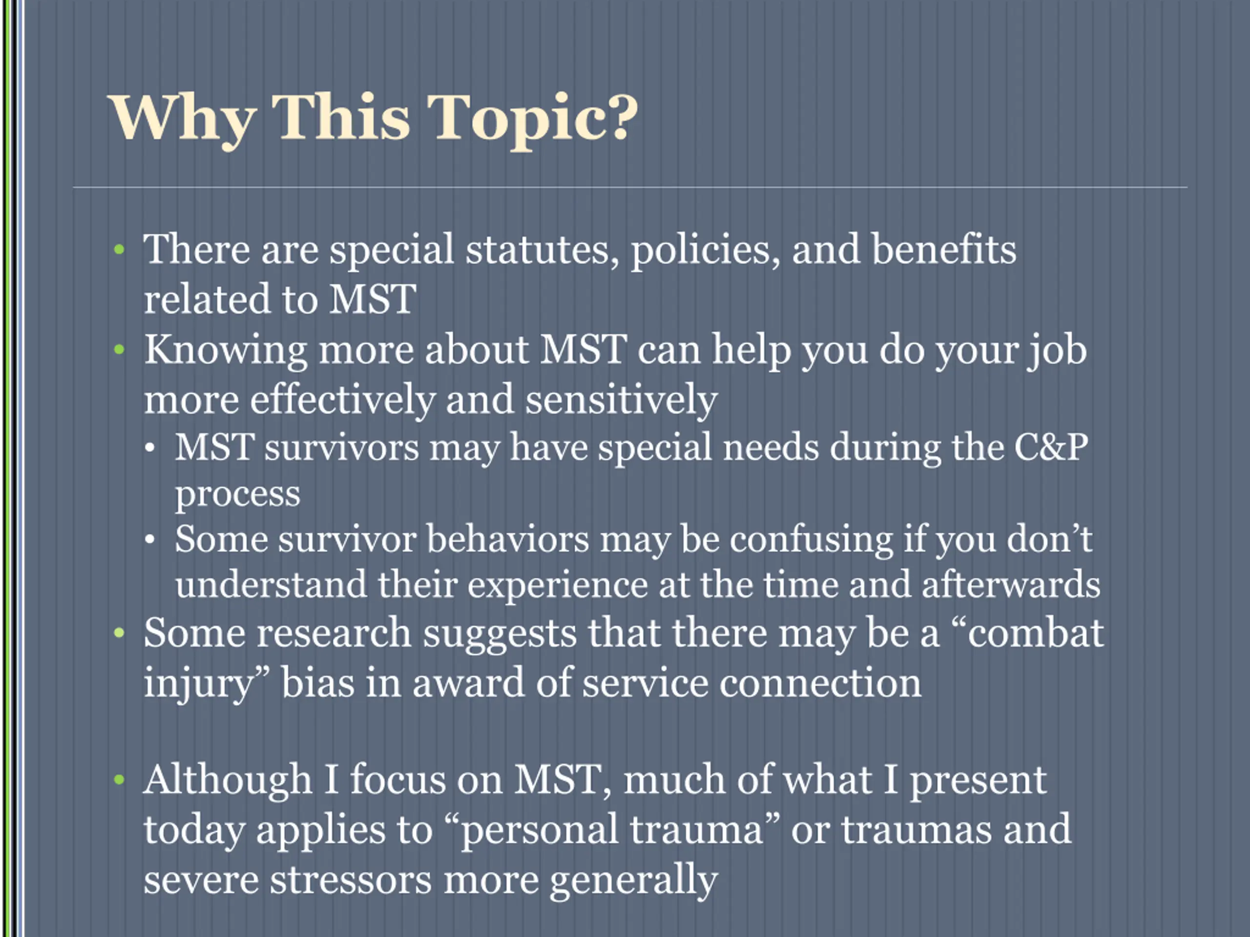 Why This Topic? There are special statutes, policies, and benefits related to MST Knowing more about MST can help you do your job more effectively and sensitively MST survivors may have special needs during the C&P process Some survivor behaviors may be confusing if you don t understand their experience at the time and afterwards Some research suggests that there may be a combat injury bias in award of service connection Although I focus on MST, much of what I present today applies to personal trauma or traumas and severe stressors more generally