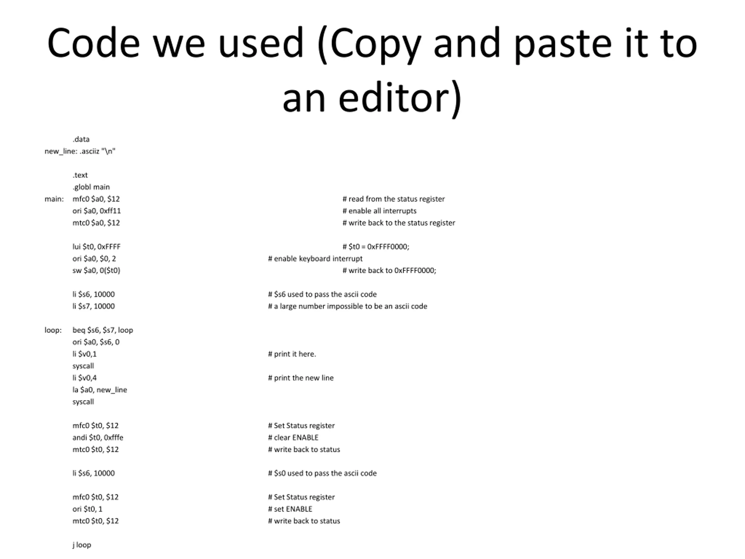 Code we used (Copy and paste it to an editor) .data new_line: .asciiz "\n" main: mfc0 $a0, $12 ori $a0, 0xff11 mtc0 $a0, $12 lui $t0, 0xFFFF ori $a0, $0, 2 sw $a0, 0($t0) li $s6, 10000 li $s7, 10000 .text .globl main # read from the status register # enable all interrupts # write back to the status register # enable keyboard interrupt # $t0 = 0xFFFF0000; # write back to 0xFFFF0000; # $s6 used to pass the ascii code # a large number impossible to be an ascii code loop: beq $s6, $s7, loop ori $a0, $s6, 0 li $v0,1 syscall li $v0,4 la $a0, new_line syscall # print it here. # print the new line mfc0 $t0, $12 andi $t0, 0xfffe mtc0 $t0, $12 # Set Status register # clear ENABLE # write back to status li $s6, 10000 # $s0 used to pass the ascii code mfc0 $t0, $12 ori $t0, 1 mtc0 $t0, $12 # Set Status register # set ENABLE # write back to status j loop
