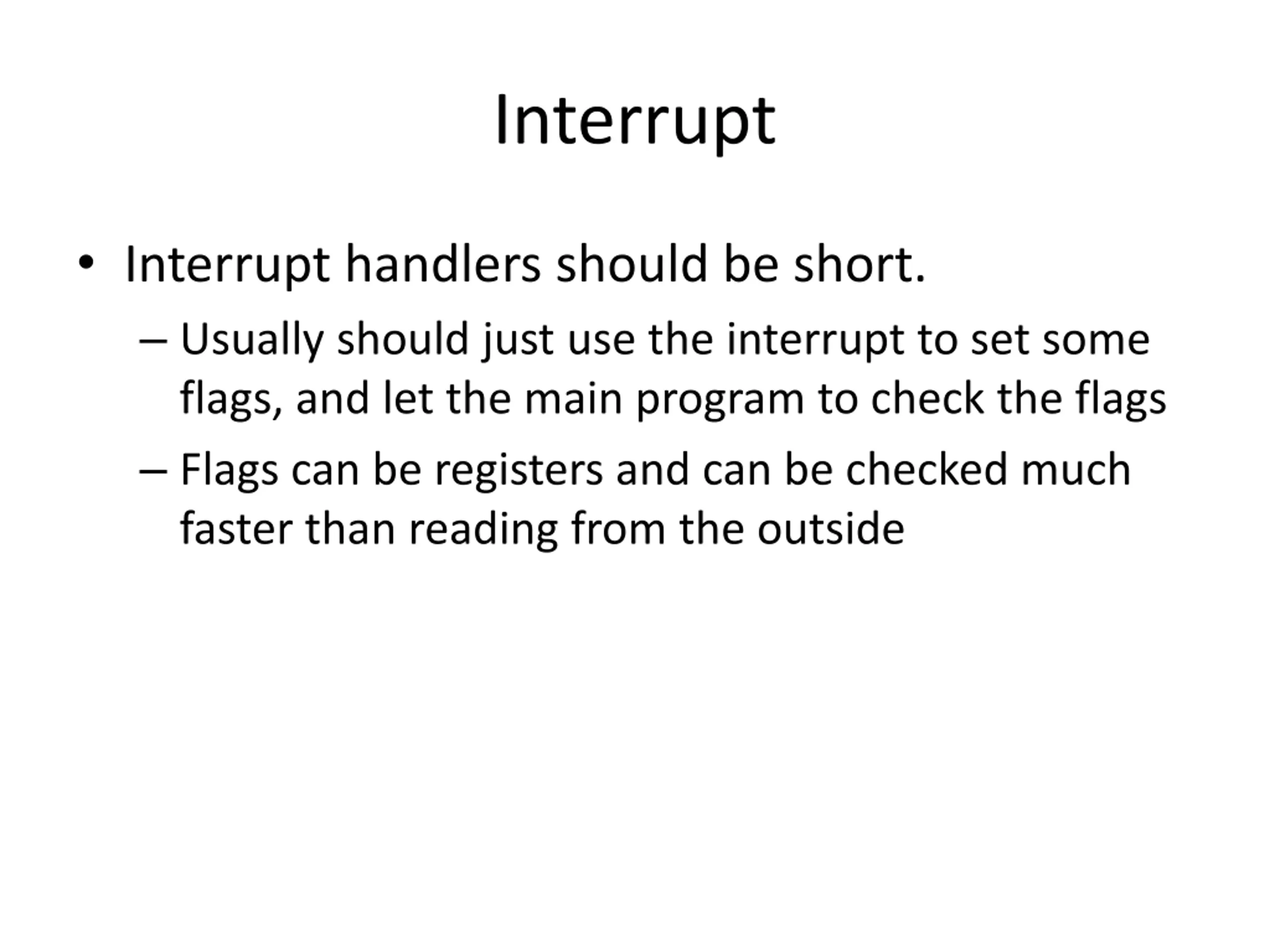 Interrupt Interrupt handlers should be short. Usually should just use the interrupt to set some flags, and let the main program to check the flags Flags can be registers and can be checked much faster than reading from the outside