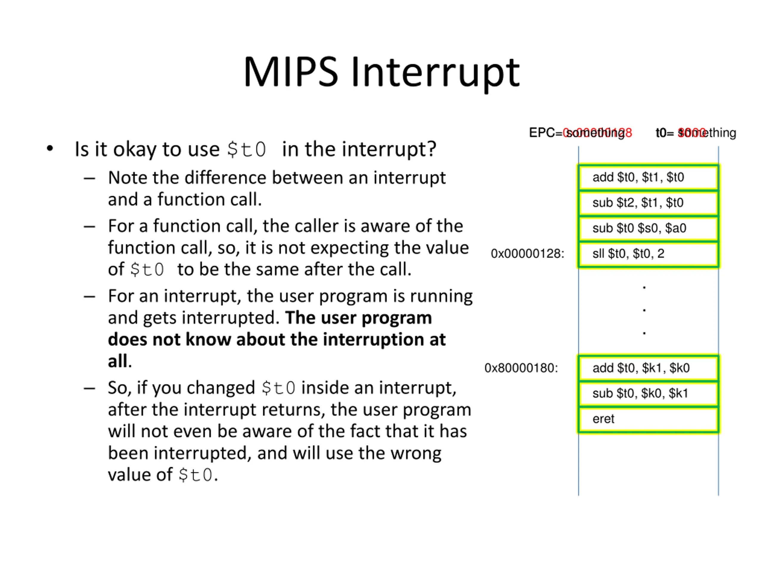 MIPS Interrupt EPC=0x00000128 EPC= something t0= something t0= 10 t0= 3000 Is it okay to use $t0 in the interrupt? Note the difference between an interrupt and a function call. For a function call, the caller is aware of the function call, so, it is not expecting the value of $t0 to be the same after the call. For an interrupt, the user program is running and gets interrupted. The user program does not know about the interruption at all. So, if you changed $t0 inside an interrupt, after the interrupt returns, the user program will not even be aware of the fact that it has been interrupted, and will use the wrong value of $t0. add $t0, $t1, $t0 a a sub $t2, $t1, $t0 a a sub $t0 $s0, $a0 a a a 0x00000128: sll $t0, $t0, 2 a . . . 0x80000180: add $t0, $k1, $k0 a a sub $t0, $k0, $k1 a a eret a a