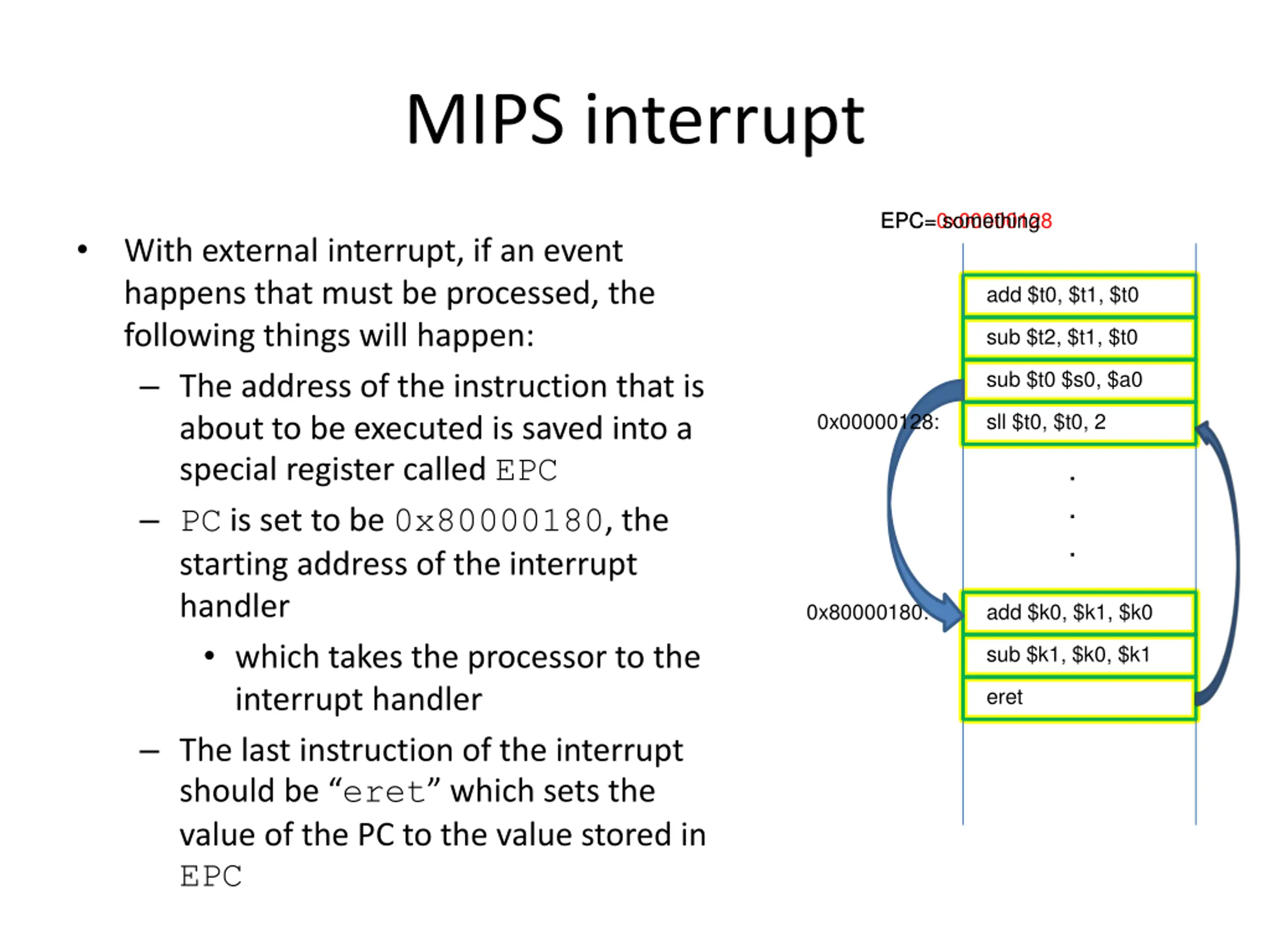 MIPS interrupt EPC=0x00000128 EPC= something With external interrupt, if an event happens that must be processed, the following things will happen: The address of the instruction that is about to be executed is saved into a special register called EPC PC is set to be 0x80000180, the starting address of the interrupt handler which takes the processor to the interrupt handler The last instruction of the interrupt should be eret which sets the value of the PC to the value stored in EPC add $t0, $t1, $t0 a a sub $t2, $t1, $t0 a a sub $t0 $s0, $a0 a a a 0x00000128: sll $t0, $t0, 2 a . . . 0x80000180: add $k0, $k1, $k0 a a sub $k1, $k0, $k1 a a eret a a