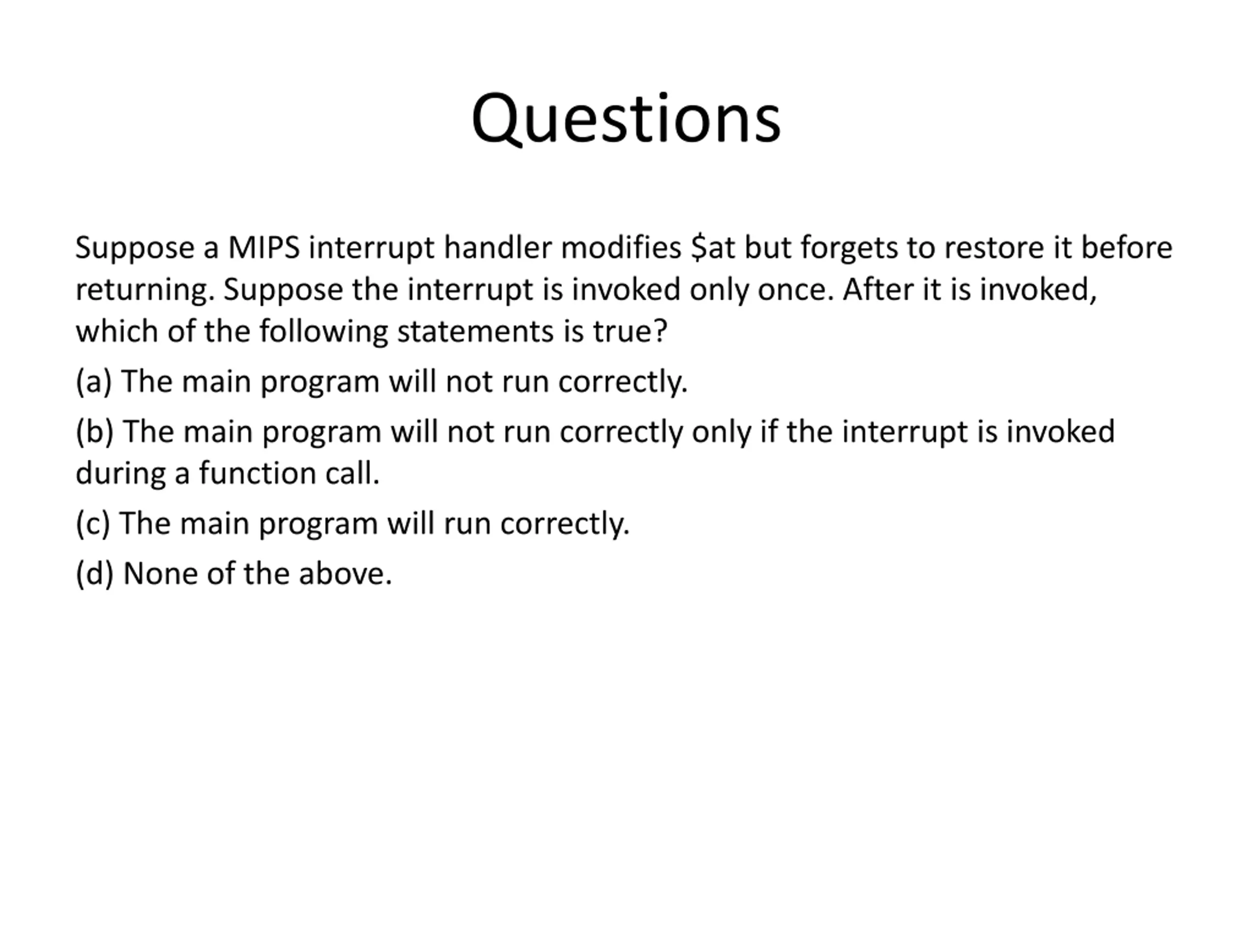 Questions Suppose a MIPS interrupt handler modifies $at but forgets to restore it before returning. Suppose the interrupt is invoked only once. After it is invoked, which of the following statements is true? (a) The main program will not run correctly. (b) The main program will not run correctly only if the interrupt is invoked during a function call. (c) The main program will run correctly. (d) None of the above.