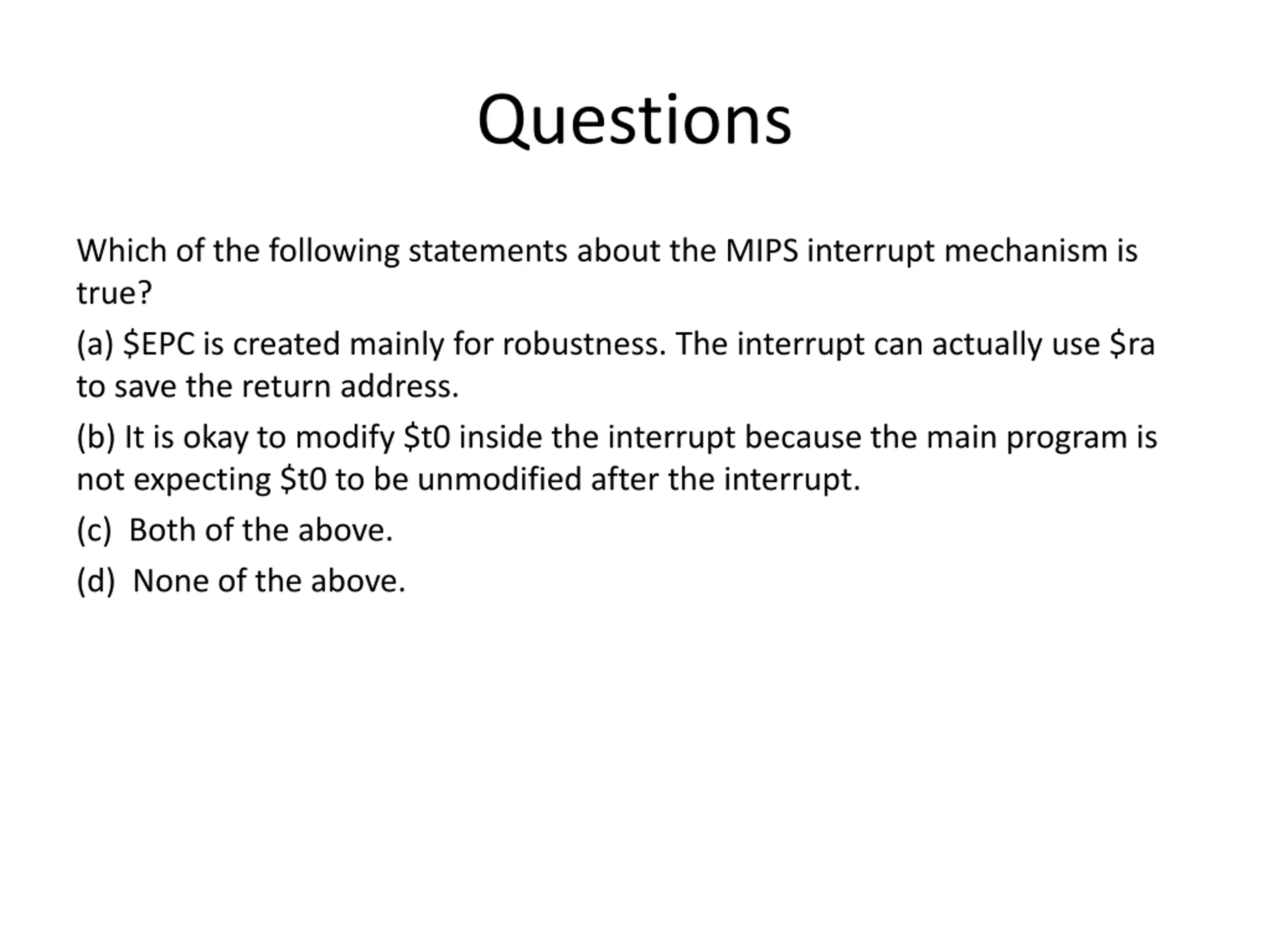 Questions Which of the following statements about the MIPS interrupt mechanism is true? (a) $EPC is created mainly for robustness. The interrupt can actually use $ra to save the return address. (b) It is okay to modify $t0 inside the interrupt because the main program is not expecting $t0 to be unmodified after the interrupt. (c) Both of the above. (d) None of the above.