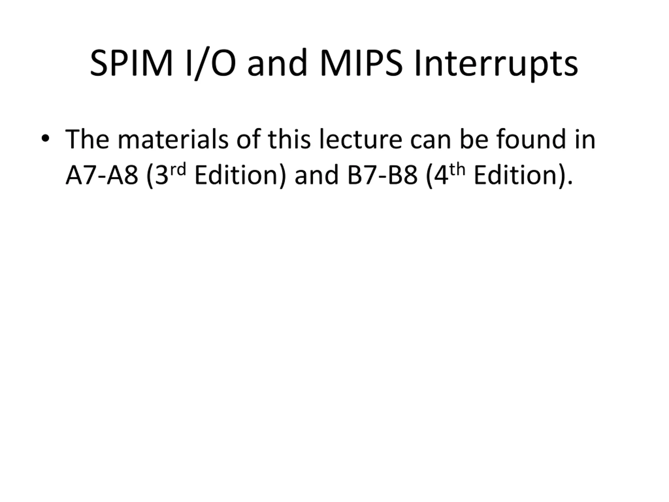 SPIM I/O and MIPS Interrupts The materials of this lecture can be found in A7-A8 (3rdEdition) and B7-B8 (4thEdition).