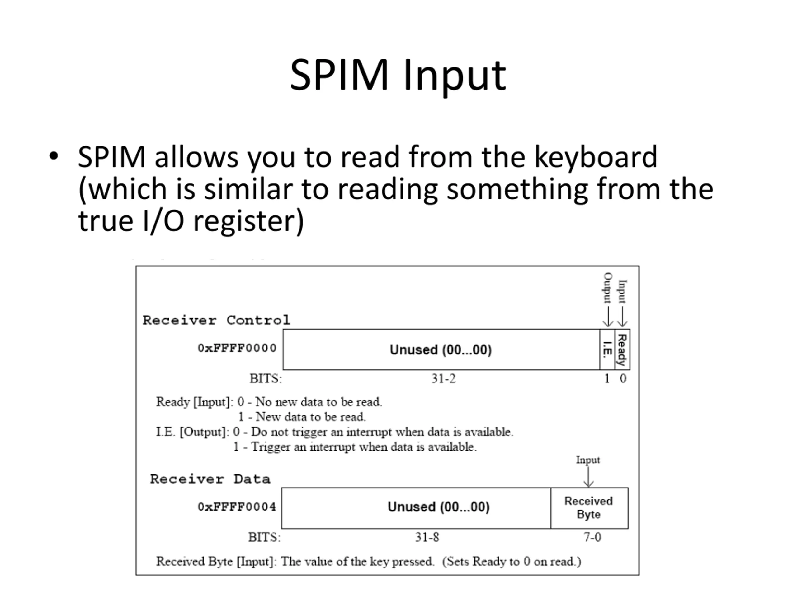 SPIM Input SPIM allows you to read from the keyboard (which is similar to reading something from the true I/O register)